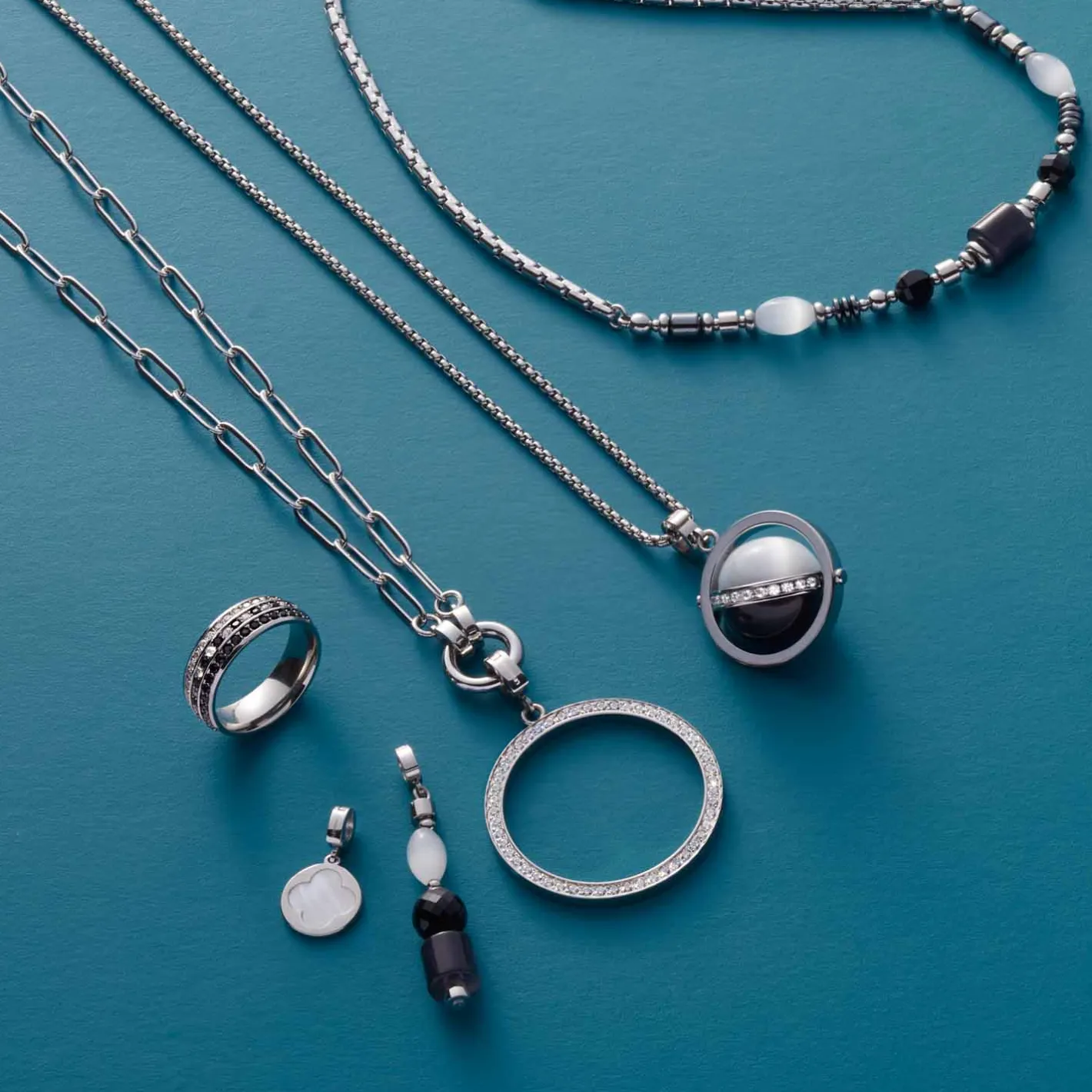 Der Anhänger wirkt dank der Mischung aus unterschiedlichen Formen so interessant und harmoniert sowohl mit eleganten als auch legeren Looks. Catseye in Schwarz, Grau und Weiß stapeln sich stimmig übereinander und werden durch kleine Stahlkugeln schön voneinander getrennt. Die Perlen finden sich auch in der Kette und dem Armband aus dem CASORIA-Set wieder – der Anhänger ist daher eine schöne Ergänzung für beide Schmuckstücke. Aber auch eine Kombination mit anderen Pieces der Clip&Mix-Serie ist mit dem Anhänger möglich.
