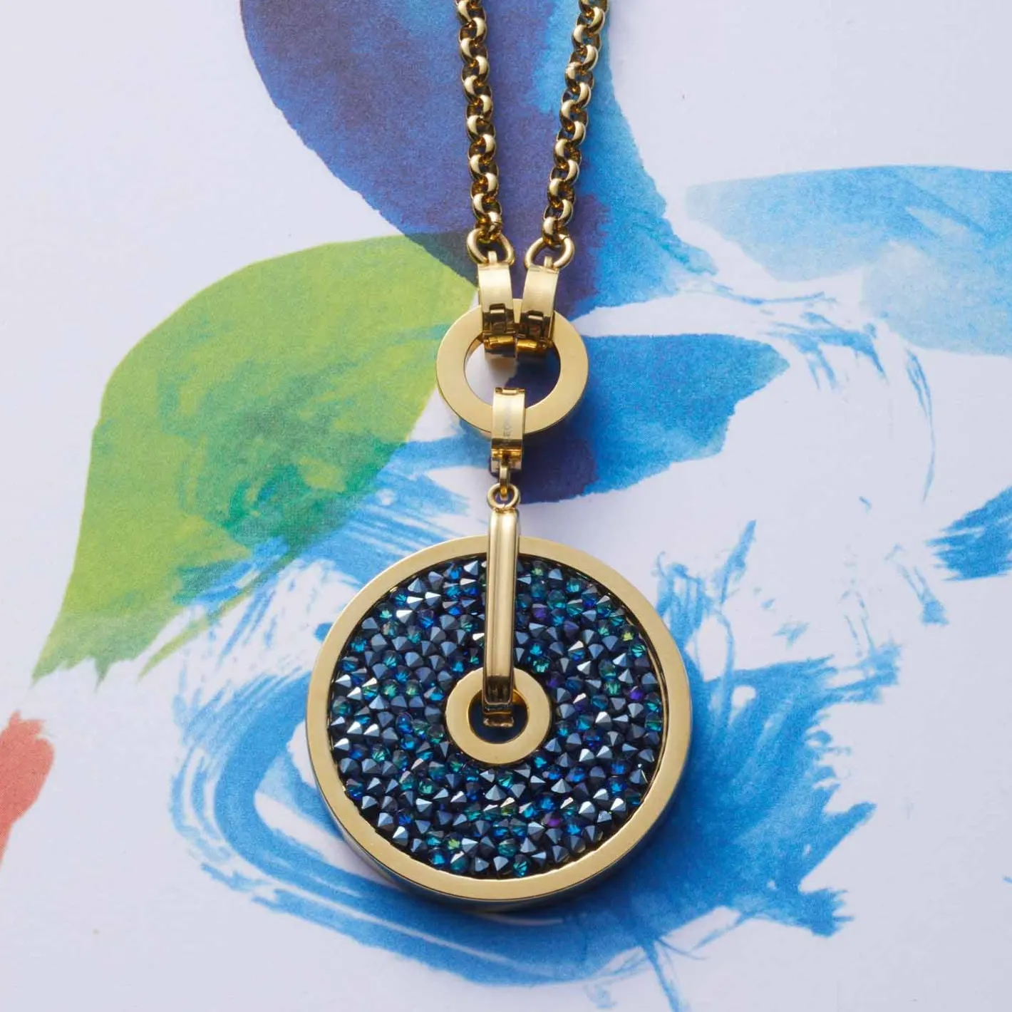 Detailverliebtheit steht bei diesem runden Anhänger im Mittelpunkt. Er besteht aus irisierenden Glaskristallen in Dunkelblau und Schwarz. Das Besondere, der Anhänger mit mittigem Loch wird durch eine Spange gehalten, wodurch er drehbar ist. Je nach Bewegung und Lichteinfall schimmern die feinen Kristalle so besonders schön und edel. Ein Schmuckstück, das jeden Look aufwertet. Als Aufhängung dient ein M-Clip und der Anhänger lässt sich mit den Teilen der Clip&Mix-Serie kombinieren.