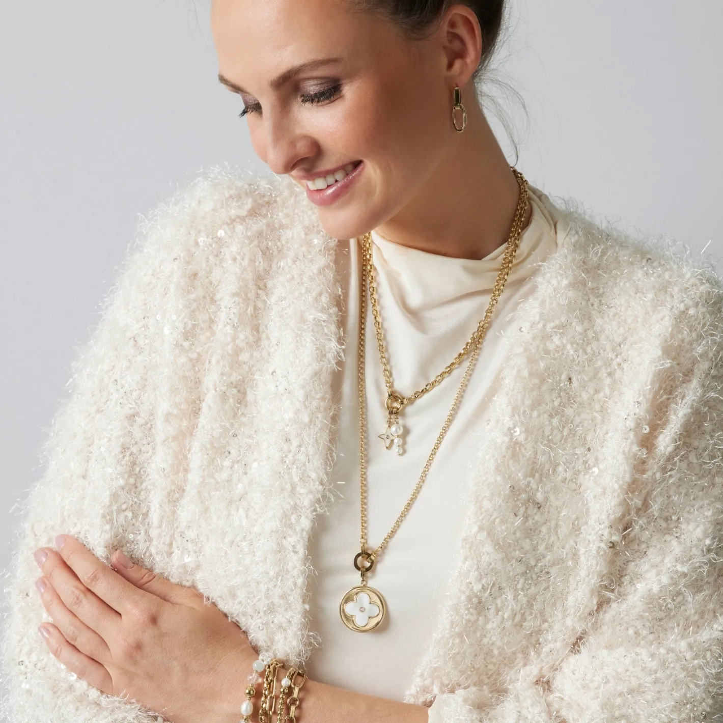 Der kleine Anhänger ist eine echte Schönheit. Aus fein glänzendem Edelstahl hergestellt, zeigt er ein Kreuzblumen-Motiv aus weißem Perlmutt auf der Vorderseite. Ein kleiner Zirkonia Stein in der Mitte veredelt den Anhänger auf exklusive und dezente Weise. Der Anhänger eignet sich perfekt für die Clip&Mix-Serie und begeistert mit seinen runden Formen.