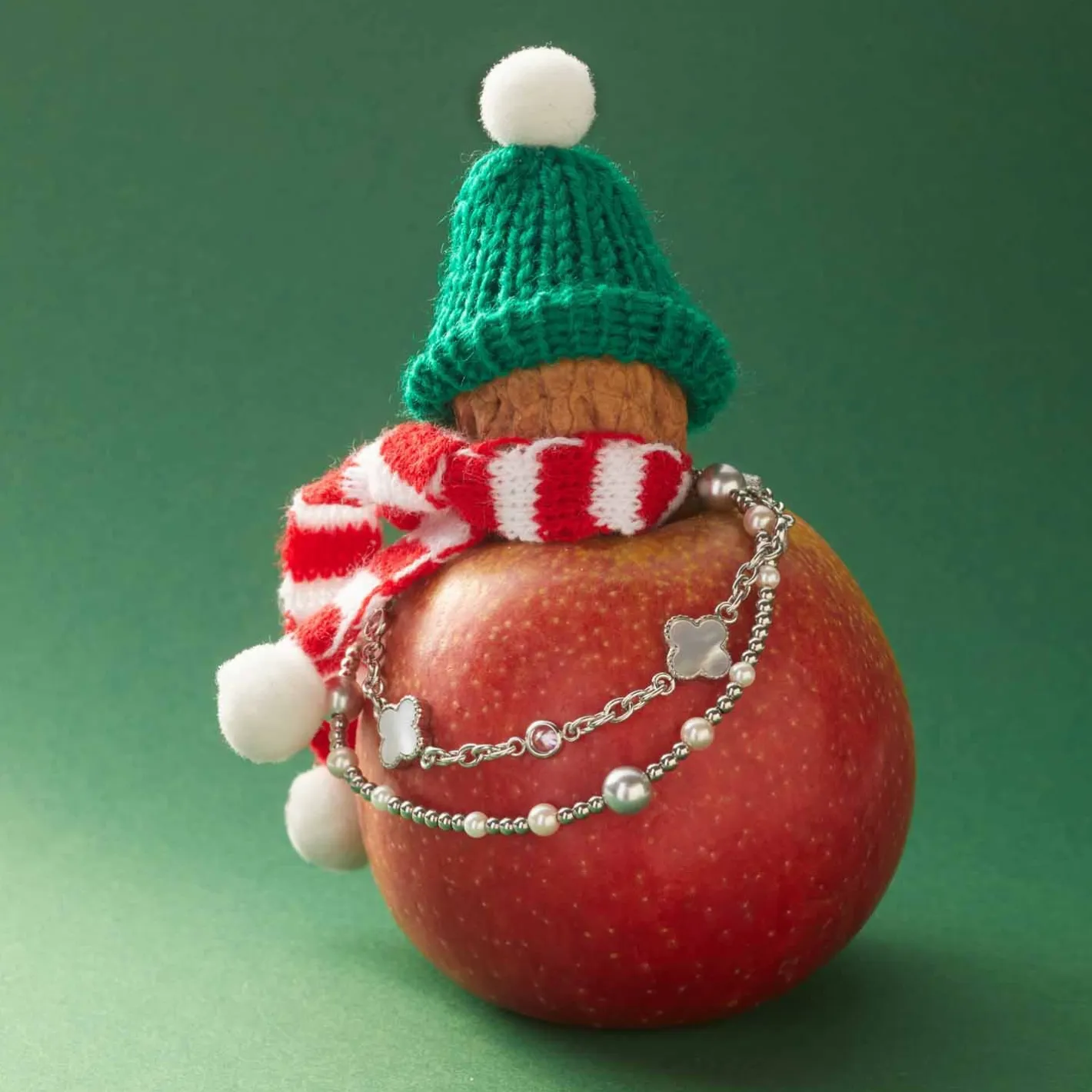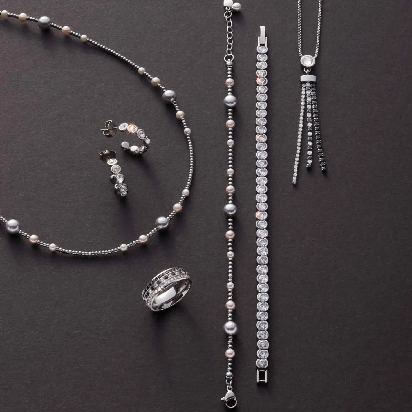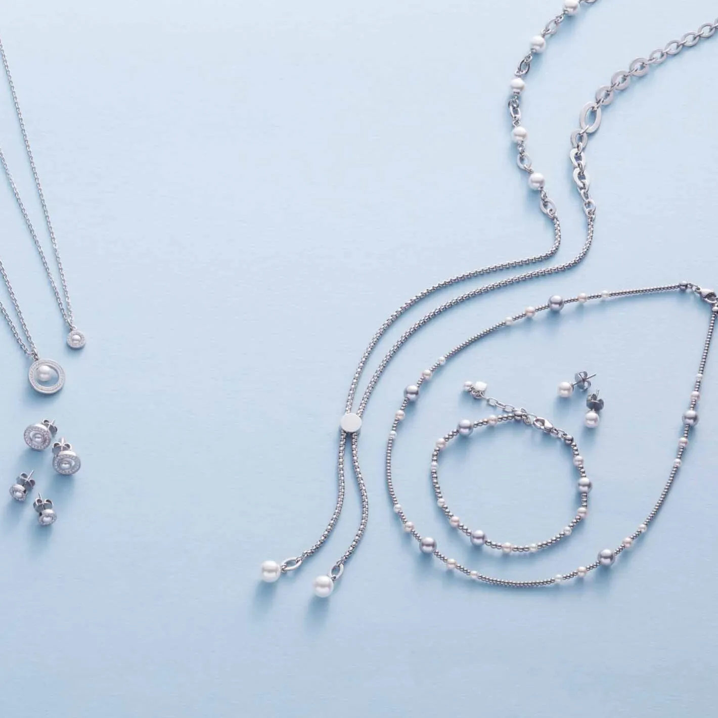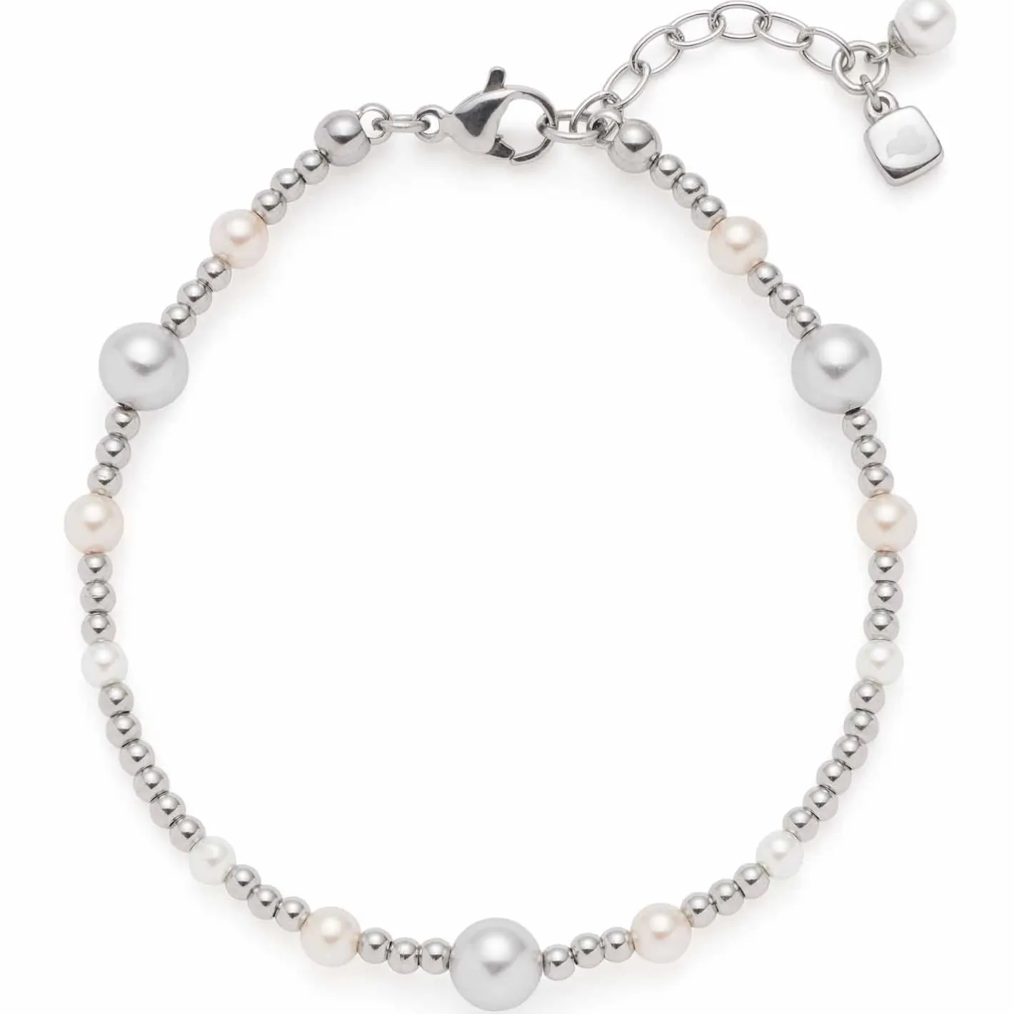 In der Kombination mit der passenden Kette Elsana oder solo getragen – das Armband verzaubert im edlen Perlen-Look. Verschieden große Perlen in Weiß, Creme und Hellgrau vereinen sich hier mit feinen Stahlkügelchen. Als besonderen Feinschliff zeigt sich die Verlängerung mit dem Karabiner mit einer weiteren Perle. Das zarte Armband passt sich wunderbar an und schmeichelt natürlichen Tönen sehr schön.
