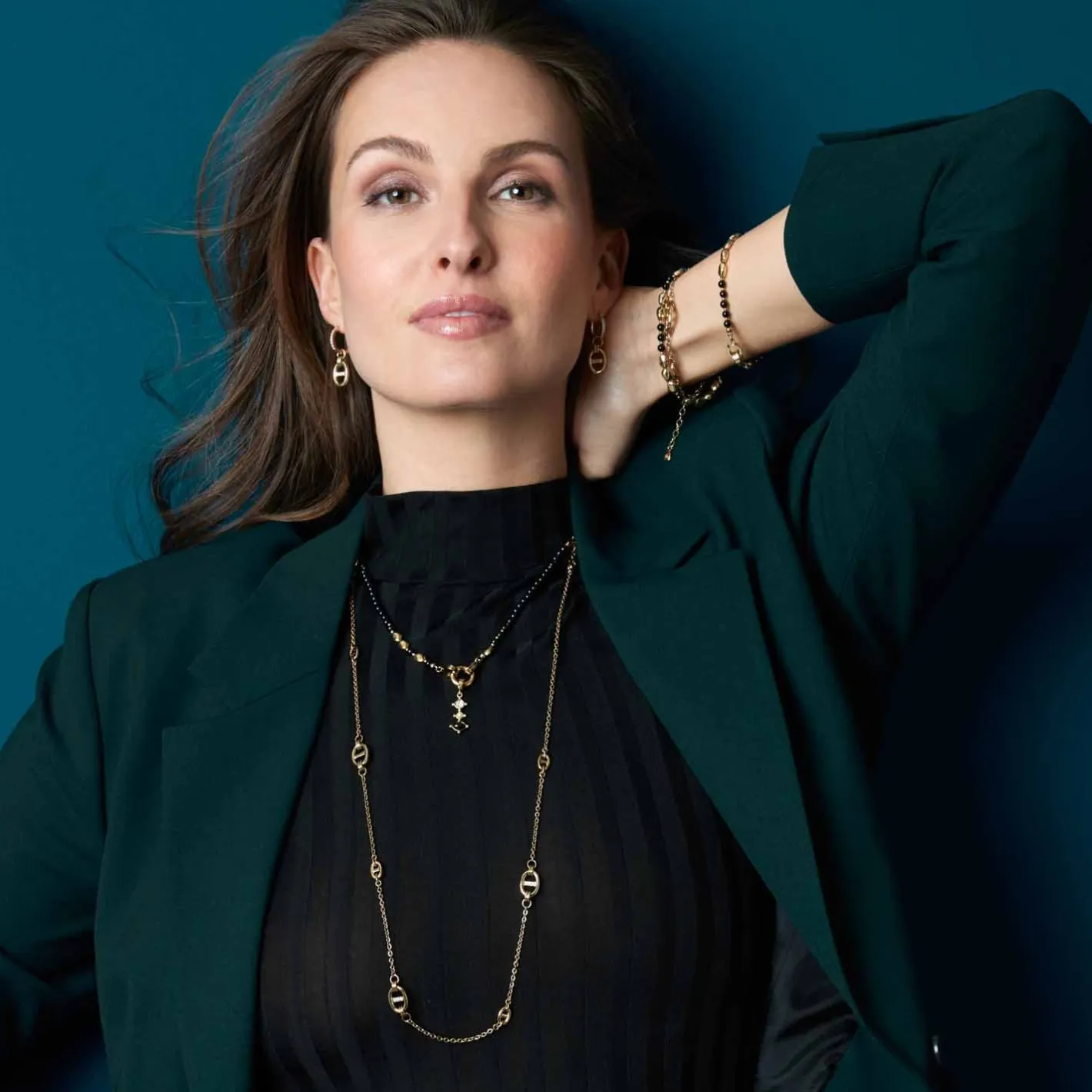 Modern und doch zeitlos – das Armband verbindet beide Stilrichtungen perfekt miteinander. In Abständen sind große und kleine Elemente in Form einer Schiffsankerkette in das Armband eingesetzt. Für ein funkelndes Highlight sorgen die Zirkonia Steine auf dem Steg der großen Elemente. Ein Karabinerverschluss und eine Verlängerungskette komplettieren das Armband. Ein wunderschönes Schmuckstück für elegant-klassische Looks.