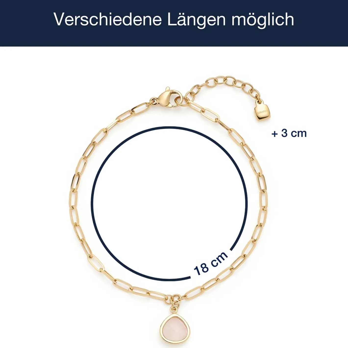Das Armband INDRA in Gold vereint modernen Stil mit sommerlicher Eleganz. Der weiße, facettierte Glasstein bildet das Zentrum des Designs und wird von einer trendigen Paperclip-Kette aus poliertem Edelstahl mit goldfarbener Veredelung eingerahmt. Die länglich-ovalen Glieder verleihen dem Schmuckstück eine moderne, strukturierte Optik, während der helle Stein durch seine Lichtreflexe für einen dezenten Schimmer sorgt. Dank Karabinerverschluss mit Verlängerungskette lässt sich das Armband individuell anpassen und angenehm tragen. Das Armband INDRA ist ein vielseitiger Begleiter, der sich perfekt für warme Tage eignet – solo getragen oder im harmonischen Zusammenspiel mit der passenden Kette INDRA.