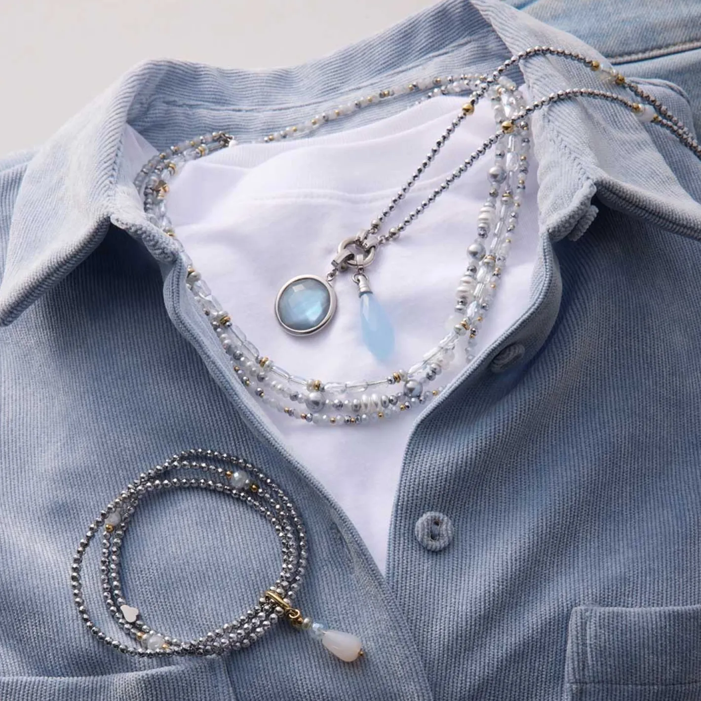 Das Armband NOURA besticht durch seine harmonische Kombination aus Farben und Materialien. Es besteht aus Hämatit, Goldkugeln, pastellblauen Glasperlen und elfenbeinfarbenen Perlen, die in einem gleichmäßigen Rhythmus angeordnet sind. Ein dekorativer Anhänger mit glänzendem Glas in Grau und Gold sorgt für einen besonderen Akzent. Das dreireihige Zugarmband liegt angenehm am Handgelenk und lässt sich durch das elastische Band mühelos anlegen. Dank der Clip&Mix-Funktion kann das Armband flexibel mit anderen Schmuckstücken kombiniert werden, um immer wieder neue Looks zu kreieren. Das kleine LEONARDO Herzlogo rundet das Design liebevoll ab.