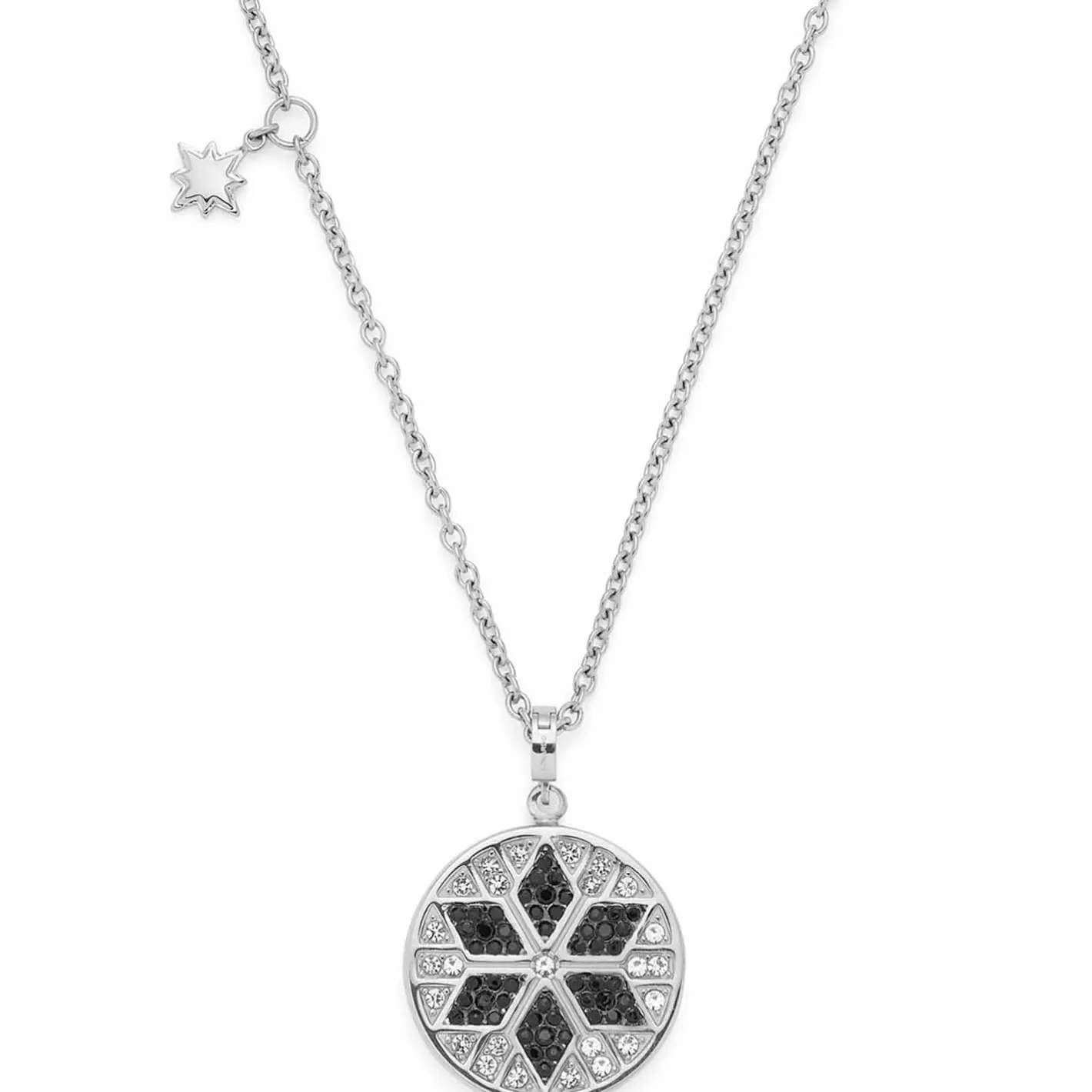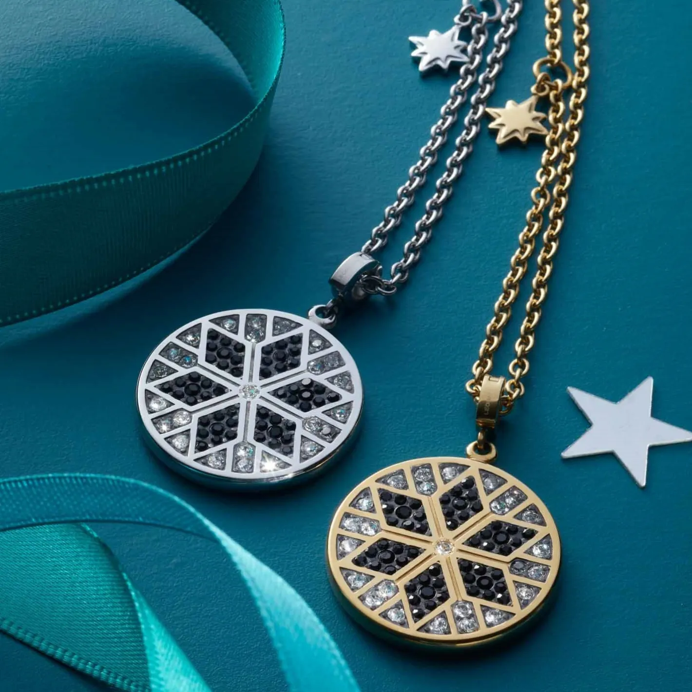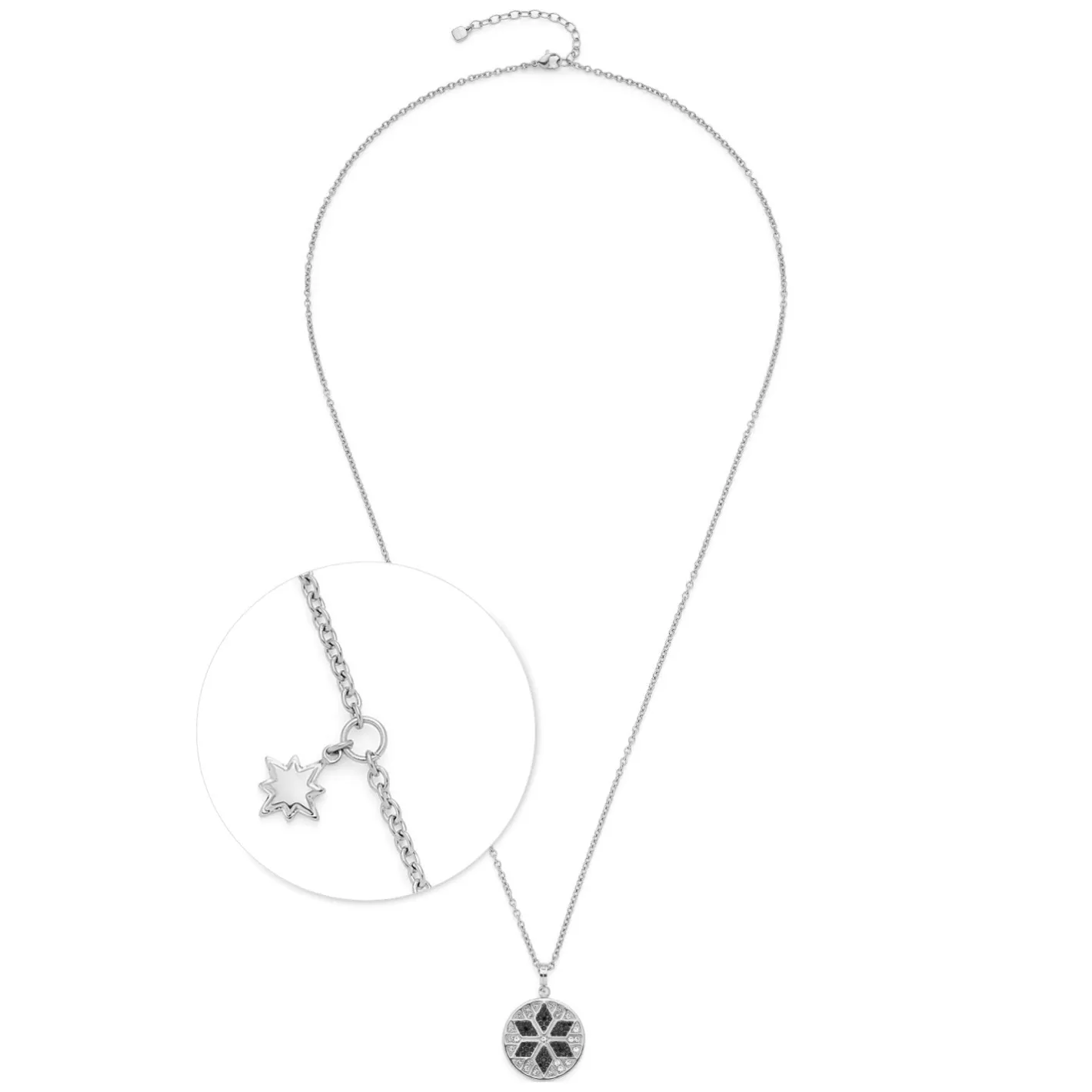Festlich, funkelnd und trotzdem filigran: Die lange Ankerkette mit abnehmbarem, rundem Anhänger in Pavé-Optik ist ein Accessoires zum Verlieben. Auf dem mit Steinen besetzten Anhänger bilden weiße und schwarze Steinchen einen aus Rauten zusammengesetzten Stern. Festtags-Looks werden mit dem weihnachtlichen Motiv stimmig und elegant abgerundet. Als kleine Besonderheit ist oberhalb des Anhängers noch ein kleiner, funkelnder Stern eingehängt. Damit zeigt sich die Kette als wahres Glanzstück, das zahlreiche Outfits veredelt.