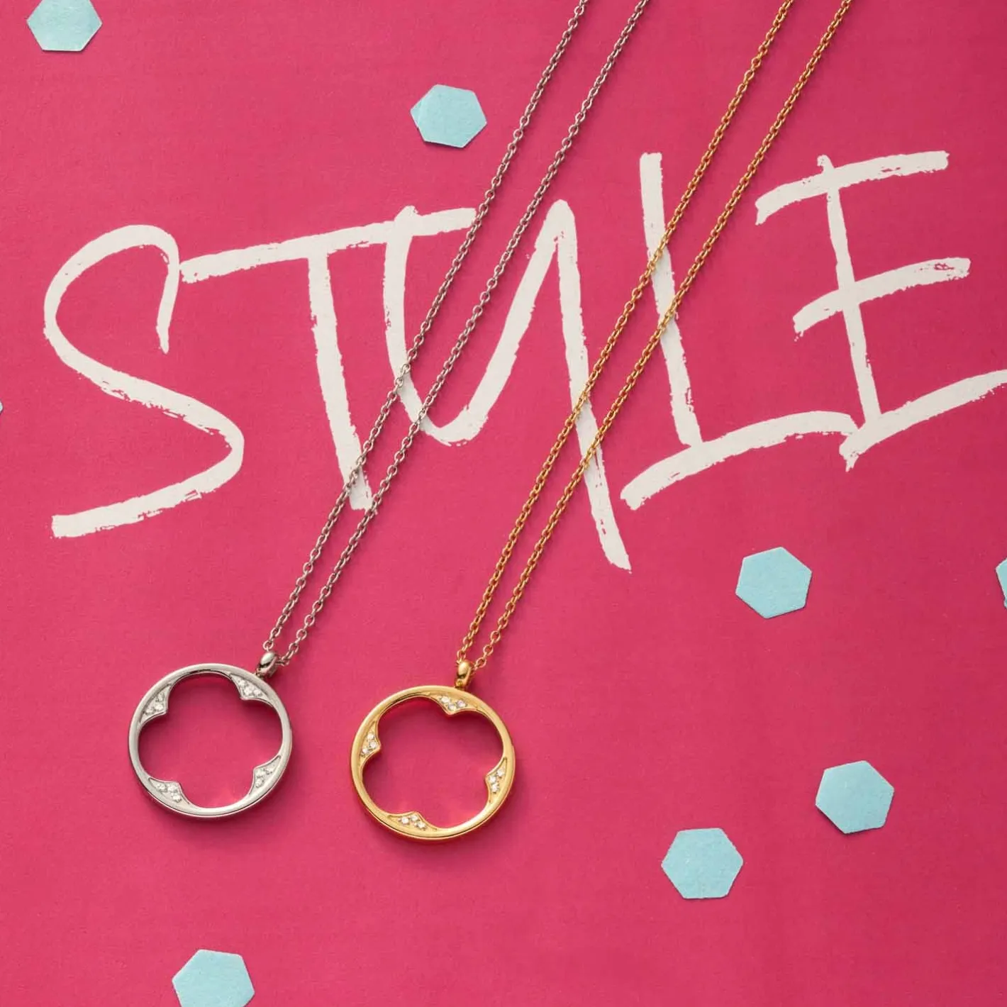 Zerbrechlich schön, hauchzart und dadurch vielseitig kombinierbar. Die lange, feine Ankerkette begeistert mit ihrem runden, offenen Anhänger. Mit seiner kleeblattförmigen Binnenform ist der Anhänger ein echtes Highlight. Ein feiner Besatz aus weißen Zirkonia Steinen auf der Kontur akzentuiert die Kette auf elegante und glamouröse Weise. Ob im trendstarken Layering-Look oder als Solokünstler – die Kette erweitert die Schmuckschatulle um einen wahren Allrounder.