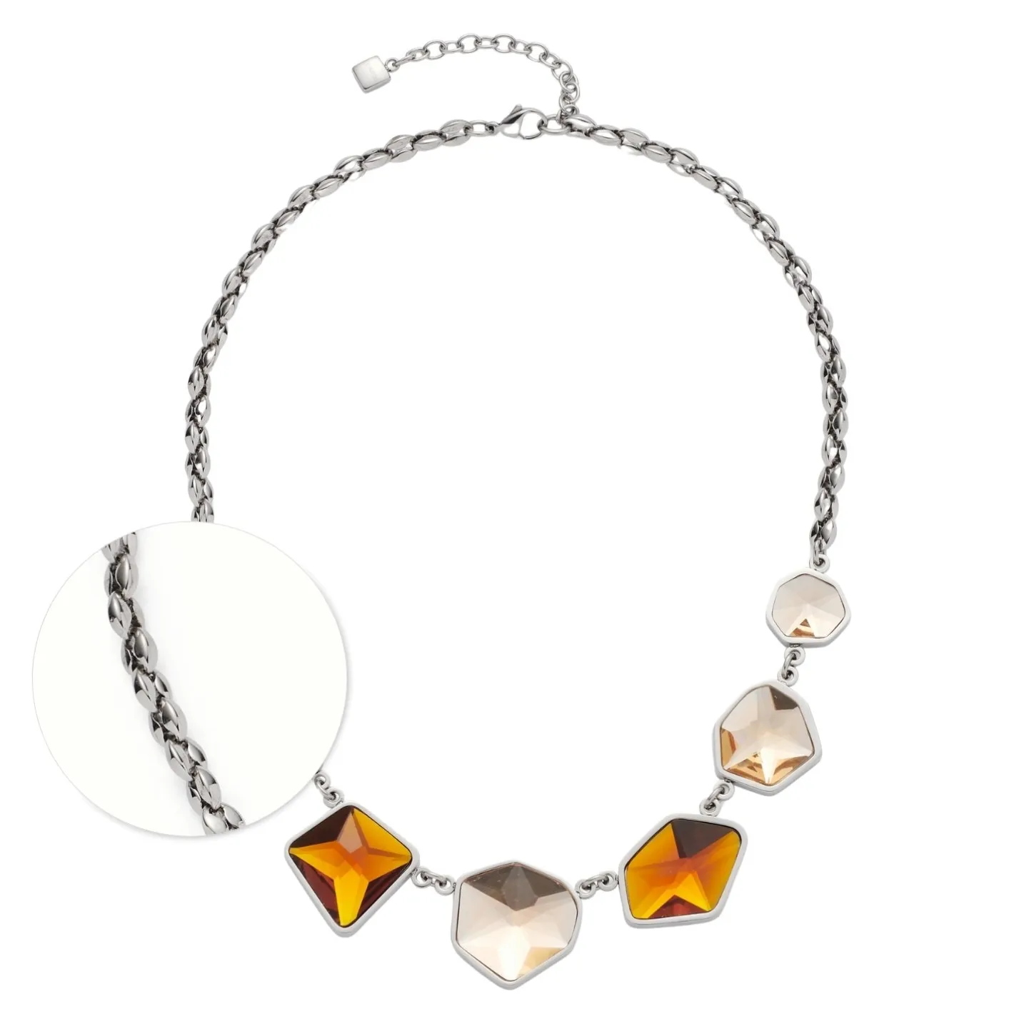 Mit Ecken und Kanten! Dieses Collier weiß seine Trägerin in den Mittelpunkt zu setzen. Plakativ geformte Glaskristalle in Brauntönen, die wie aus der Rohform herausgebrochen sind, heben sich mit natürlicher Schönheit und Extravaganz hervor. Das opulente Statement der Kristallglassteine wird von kräftigen Kettengliedern stilvoll unterstrichen.
