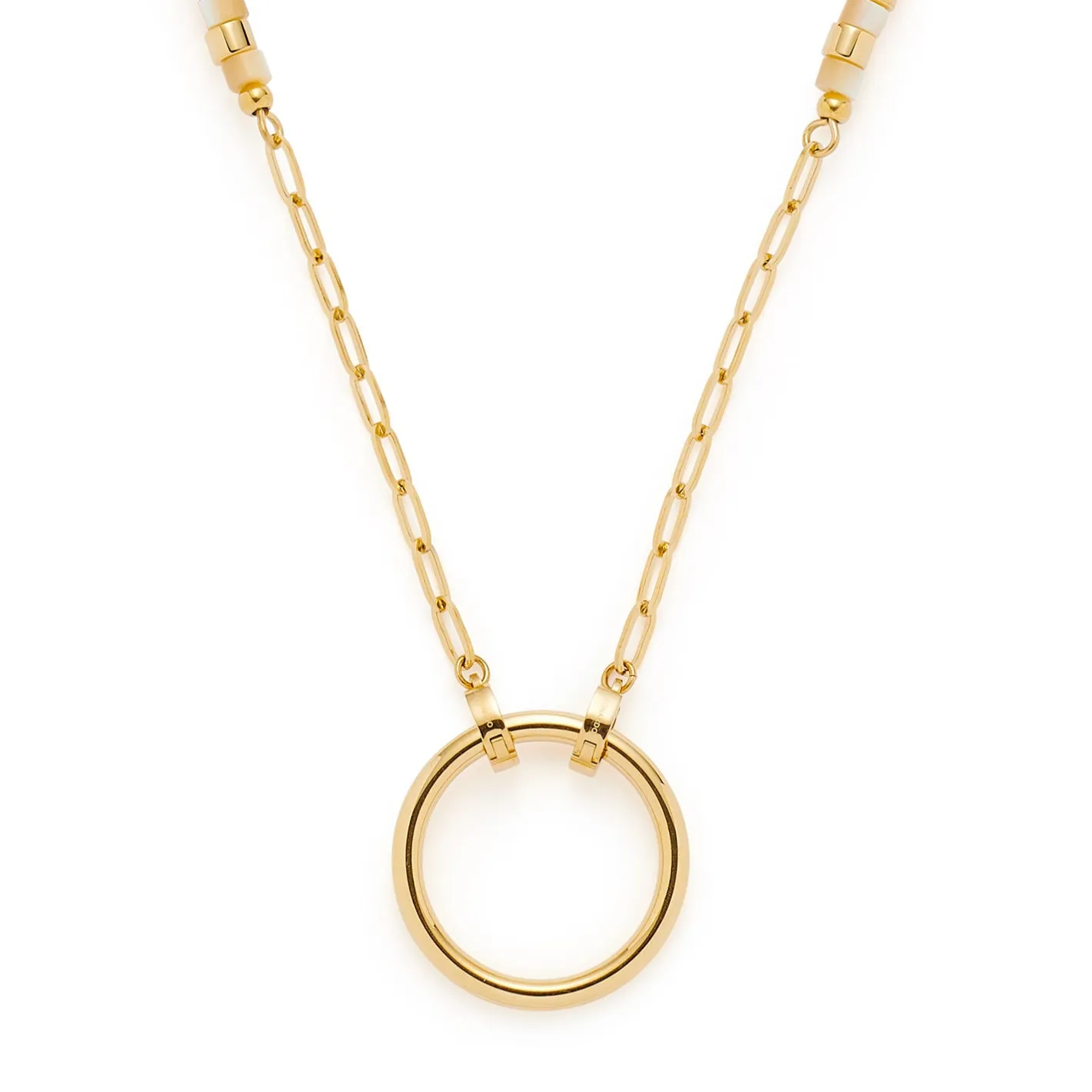 Ein Klassiker mit einer modernen Raffinesse und so vielseitig kombinierbar. Die vergoldete Paperclip-Kette wird von walzenförmigen Elementen aus Perlmutt und Metall unterbrochen – dadurch entsteht eine schöne Streifen-Optik. Trage diese zeitlose Halskette für einen monochromen Look alleine oder mixe sie mit stilvollen Charms aus unserer Kollektion – der plakative Clipring in der Mitte bietet dafür einen optimalen Platz.