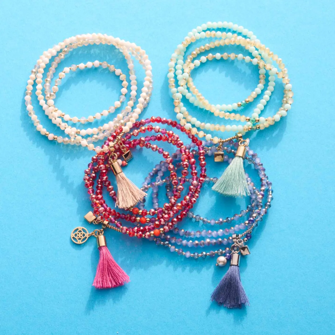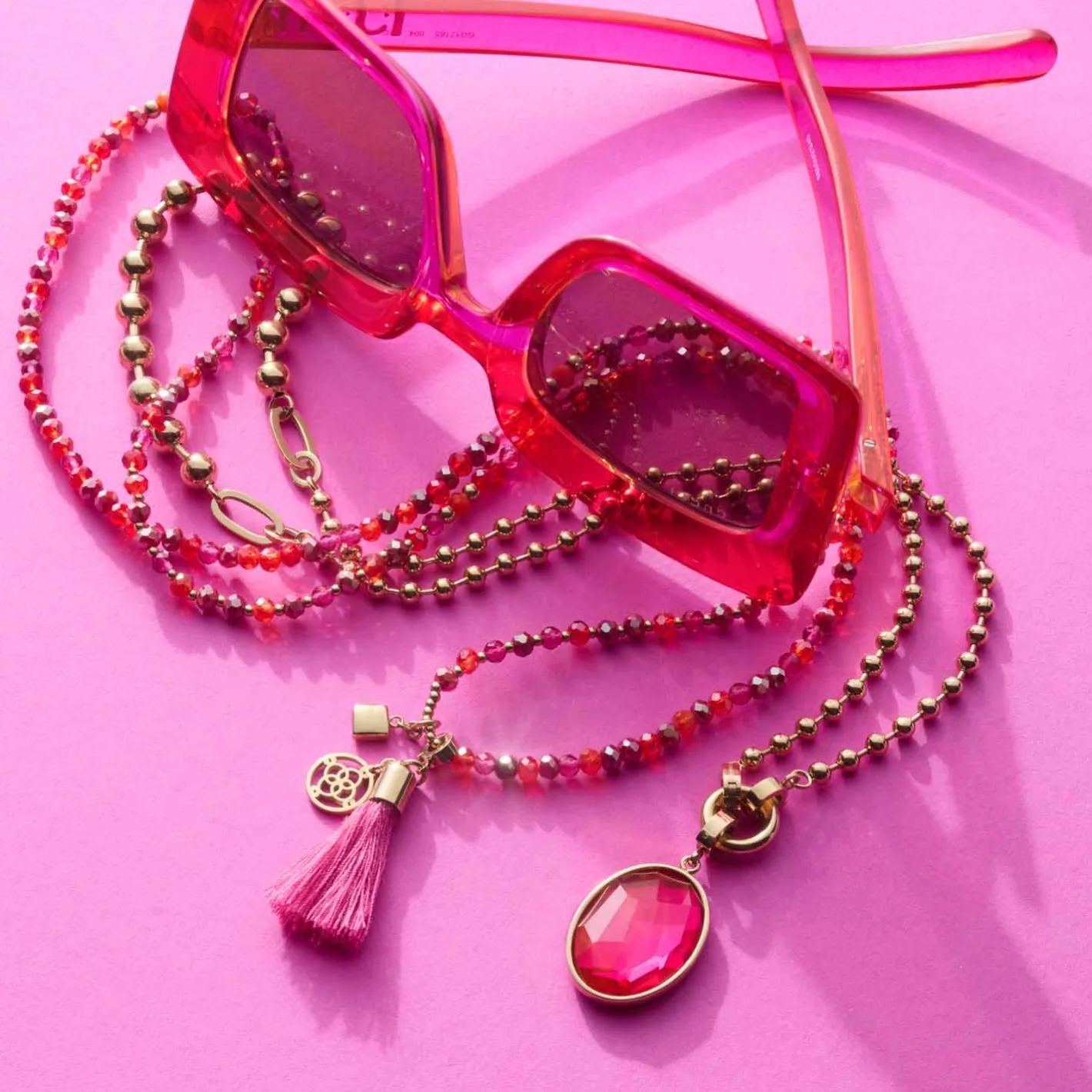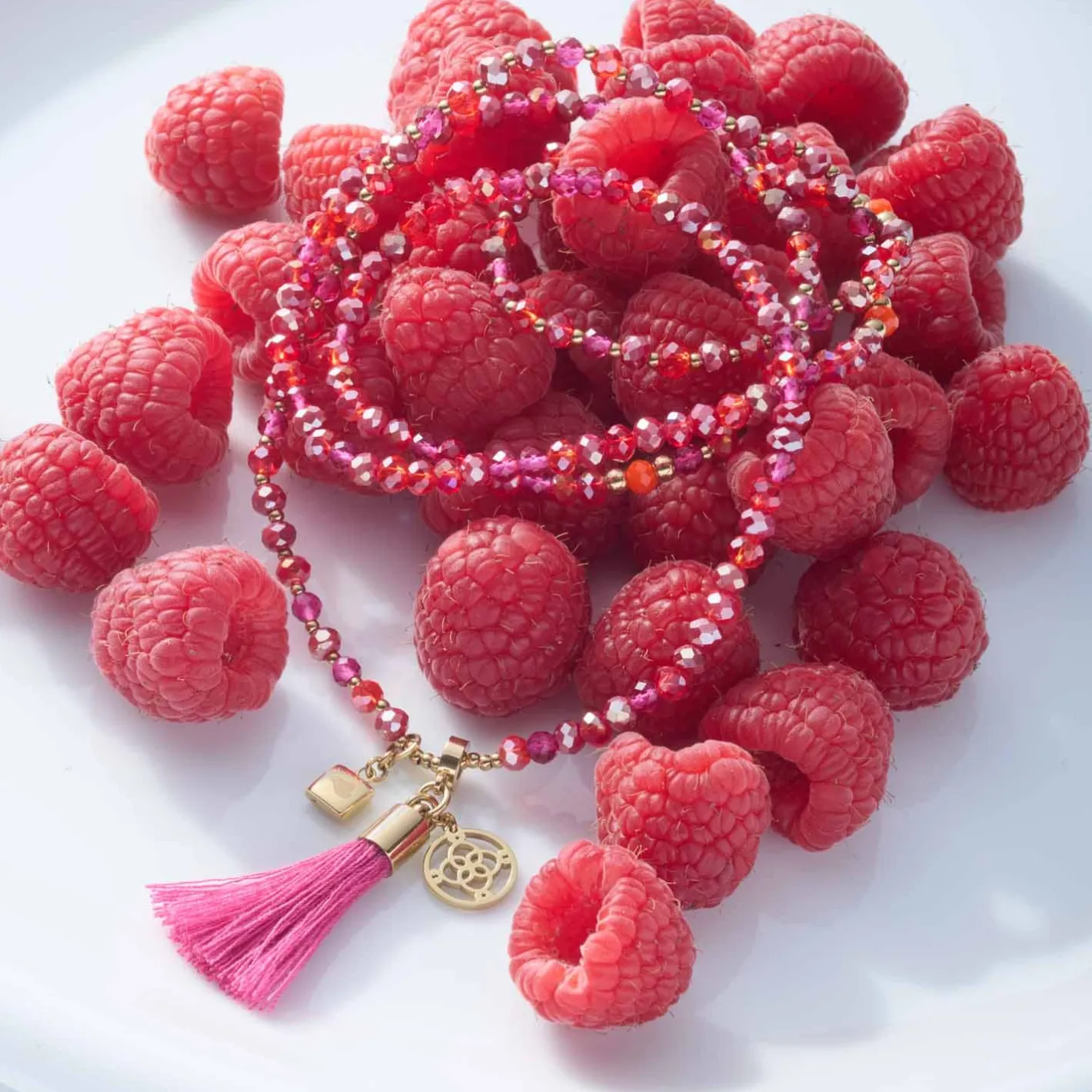 Mit dieser Kette kannst du dir das Sommergefühl und die gute Laune nach Hause holen. Die feuerpolierten Glasperlen erstrahlen in saftigem Pink bis Rot und erhalten mit einzelnen Goldkugeln ein edles Upgrade. Diese Freiheit des Sommers spiegelt sich auch in der Kette wider – du kannst sie dank des elastischen Bandes einfach über den Kopf ziehen oder mehrfach um das Handgelenk wickeln. Eine Quaste zum Abnehmen und kleine Anhänger runden das erfrischende Design ab.