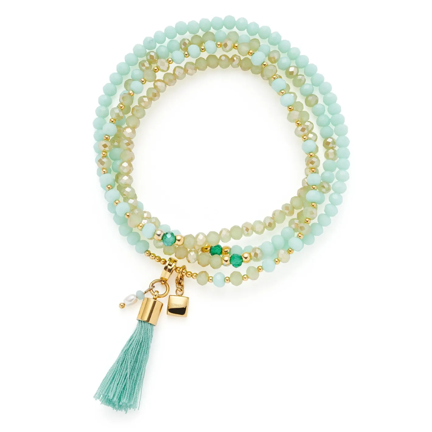 Mit dieser Kette trägst du den Sommer bei dir! Glasperlen in sanften Türkis- und Grüntönen verbreiten Frische, während goldene Elemente einen Hauch Eleganz hinzufügen. Das flexible Band sorgt für Vielseitigkeit: ob locker um den Hals oder mehrmals ums Handgelenk gewickelt – alles ist möglich. Kleine Anhänger und eine abnehmbare Quaste verleihen dem Design eine spielerische Leichtigkeit. Style dazu am besten weiteren Goldschmuck.