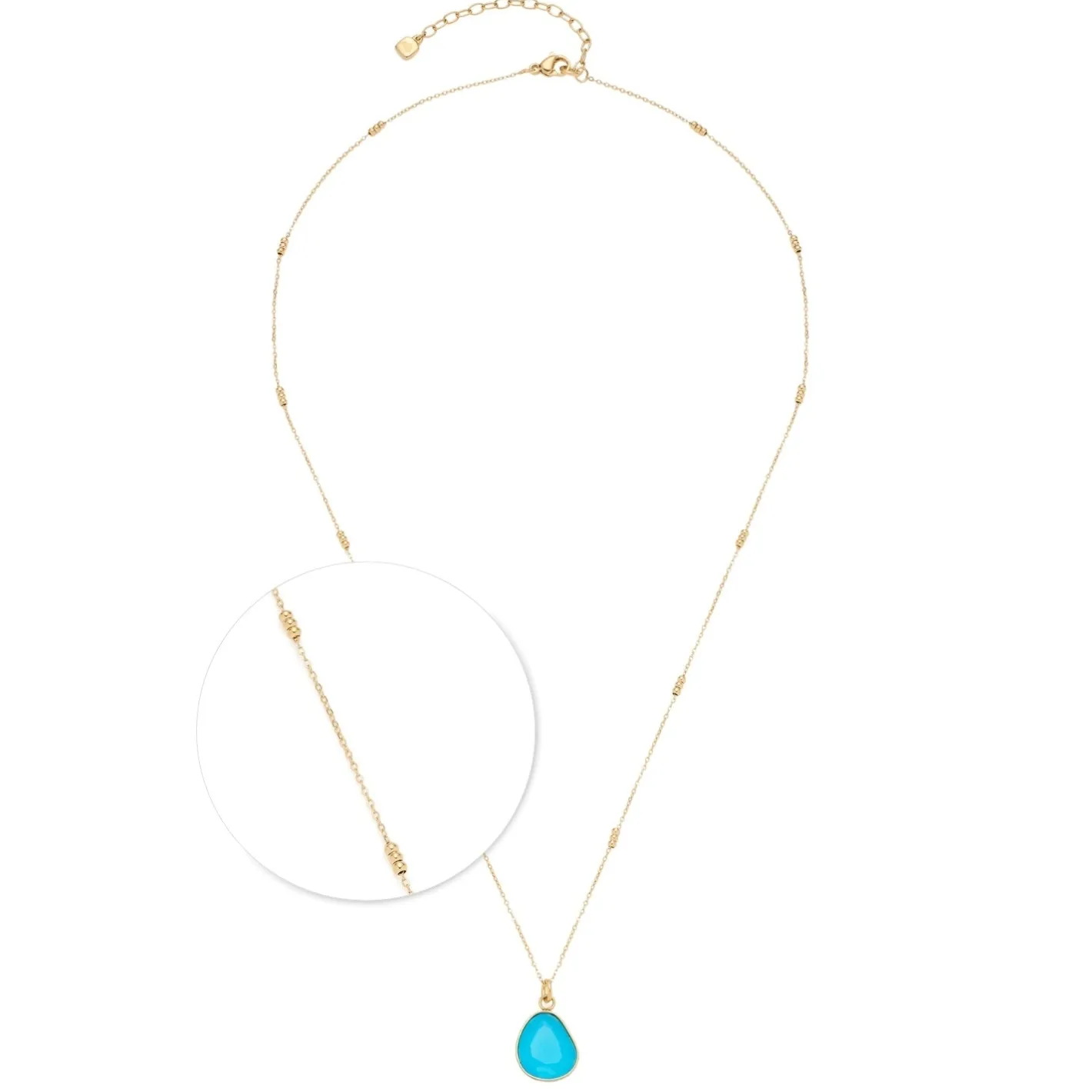 Diese mittellange und feine Spiegel-Ankerkette wird von eingesetzten Mini-Edelstahl-Kügelchen unterbrochen. Highlight der Halskette ist natürlich der organisch geformte, tropfenförmige Anhänger. Der offene Rahmen fasst einen facettierten opaken Glasstein in strahlendem Azur-Blau. Das ist Sommer-Feeling pur. Die Komposition mit goldener Ionenplattierung wirkt besonders schön.