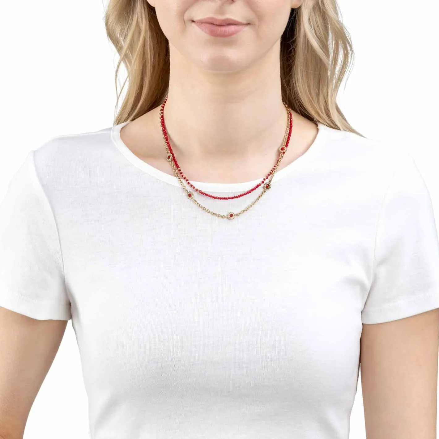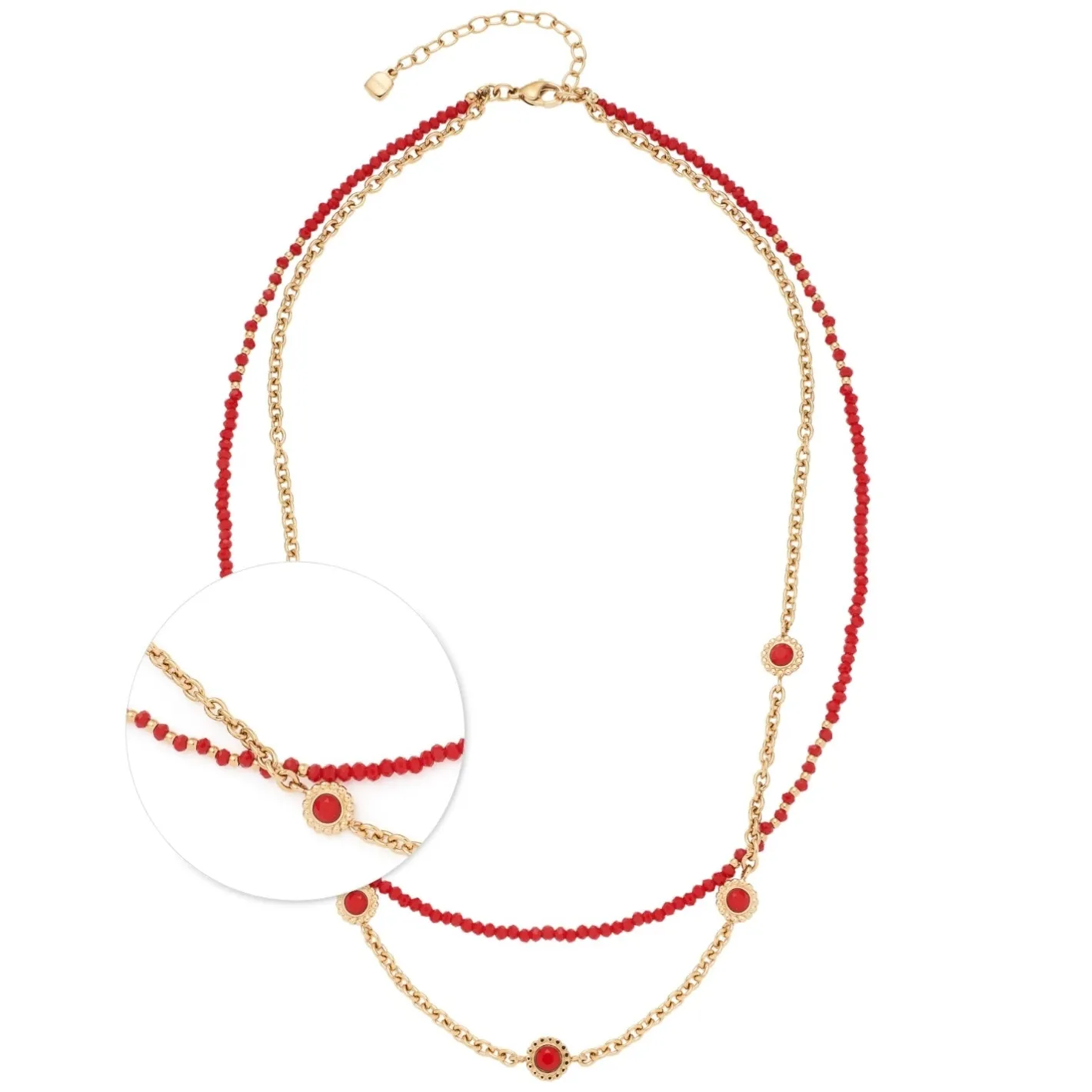 Die zweireihige Halskette ist mit der trendstarken Farbkombination gold-rot ein echter Hingucker. Eine Reihe bilden winzige, dunkelrote und facettierte Glasperlen, die durch kleine, goldene Edelstahlkügelchen kontrastiert werden. Eine schlichte Ankerkette bildet den zweiten Strang. In regelmäßigen Abständen sind runde, abstrahierte und mit dunkelrotem, facettiertem Glasstein komplettierte Blüten-Elemente in die Kette eingehangen. Mit einem hohen Maß an Fashion-Know-how setzt das kurze Collier das Dekolleté in Szene.