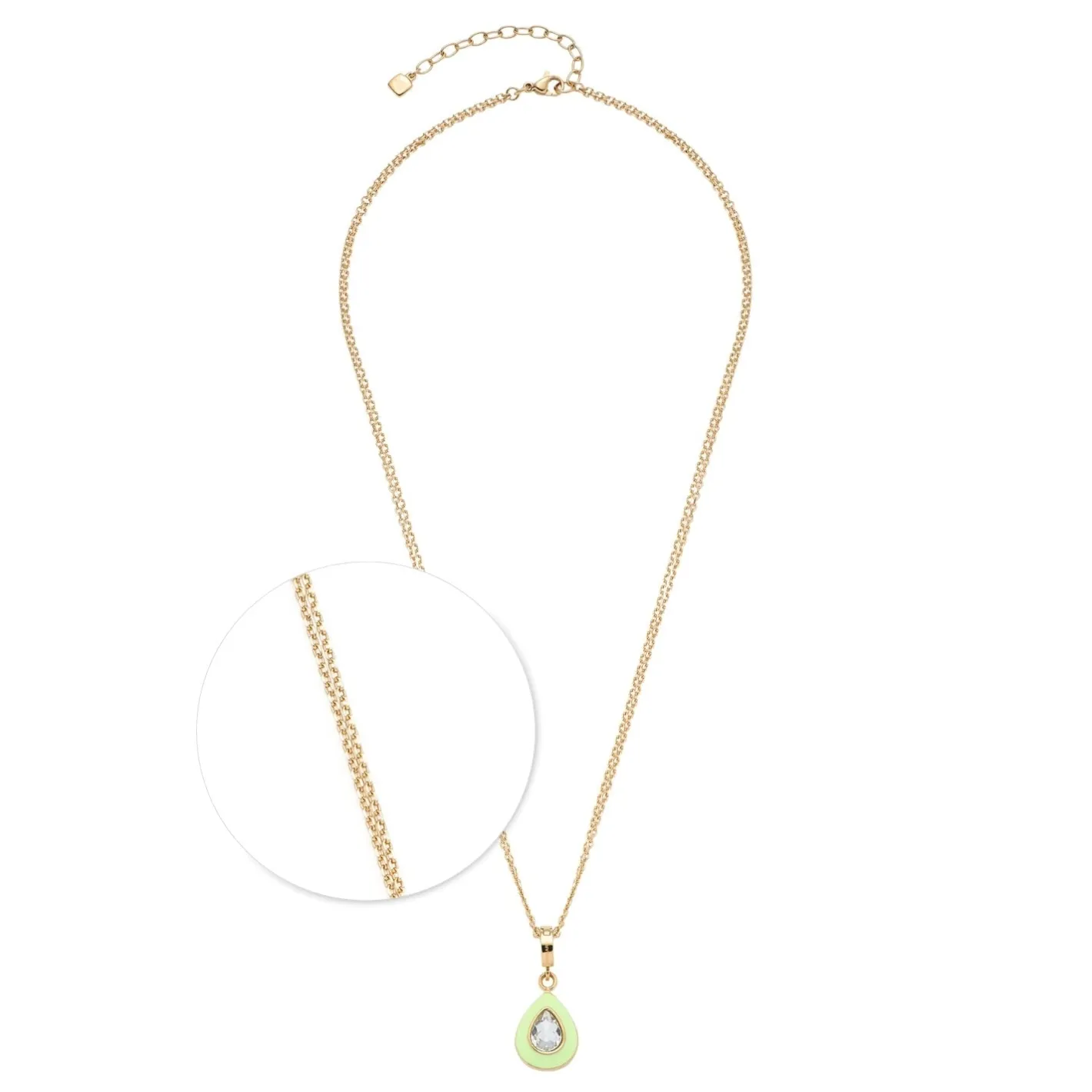 Eine apfelgrüne Epoxidharz-Beschichtung umrandet einen klaren Glaskristall mit funkelndem Facettenschliff. Ein kurzes, diamantiertes Ankerkettchen in zwei Reihen ergänzt die aussagekräftige Wirkung des Clip-Charms in Tropfenform. Zusammen ergeben sie ein elegantes Schmuckstück für luftig leichte Frühlings- und Sommer-Looks.