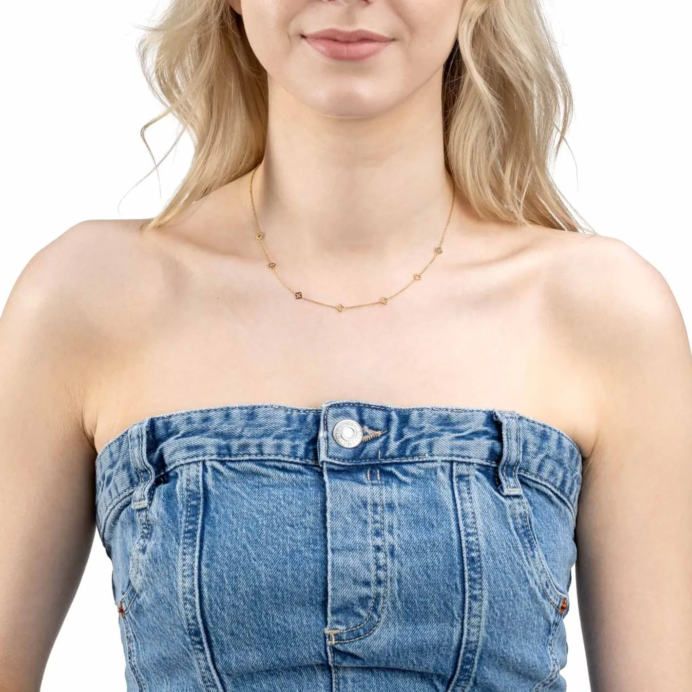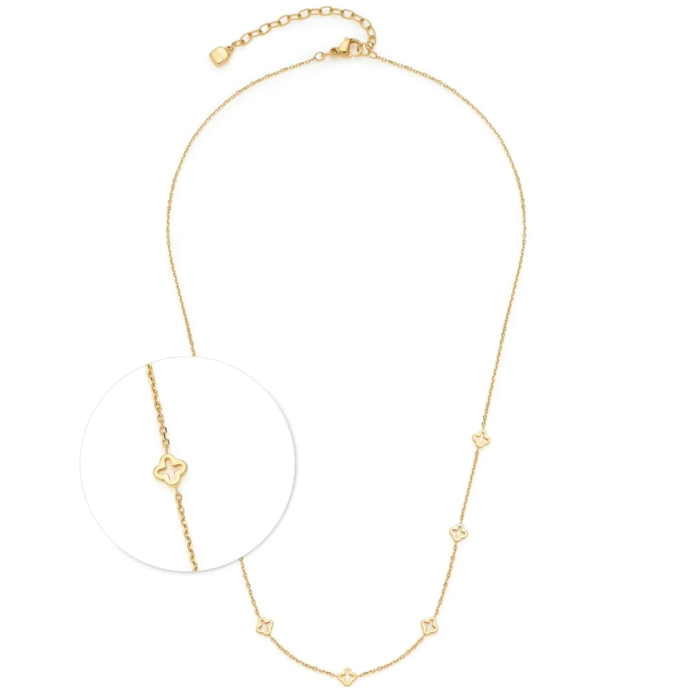 Die elegante, kurze Halskette ist ein ideales Accessoire für moderne Stacking-Looks, kann jedoch auch als Einzelstück überzeugen. Die filigrane Spiegel-Ankerkette aus golden ionenplattiertem Edelstahl ist mit charmanten Kleeblatt-Ornamenten verziert, die einen verspielten Akzent setzen. Dank der Verlängerungskette lässt sich die Länge ganz individuell anpassen.
