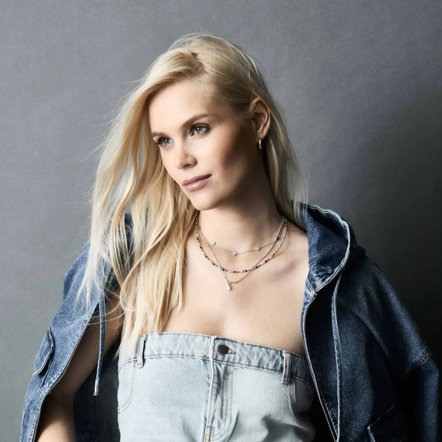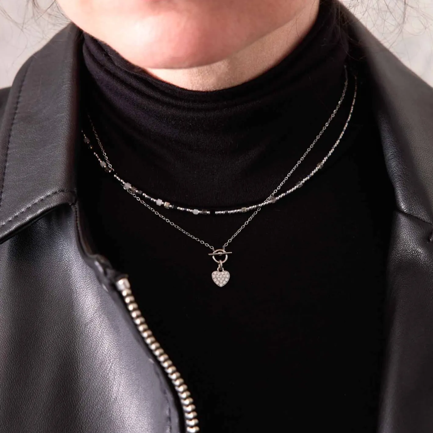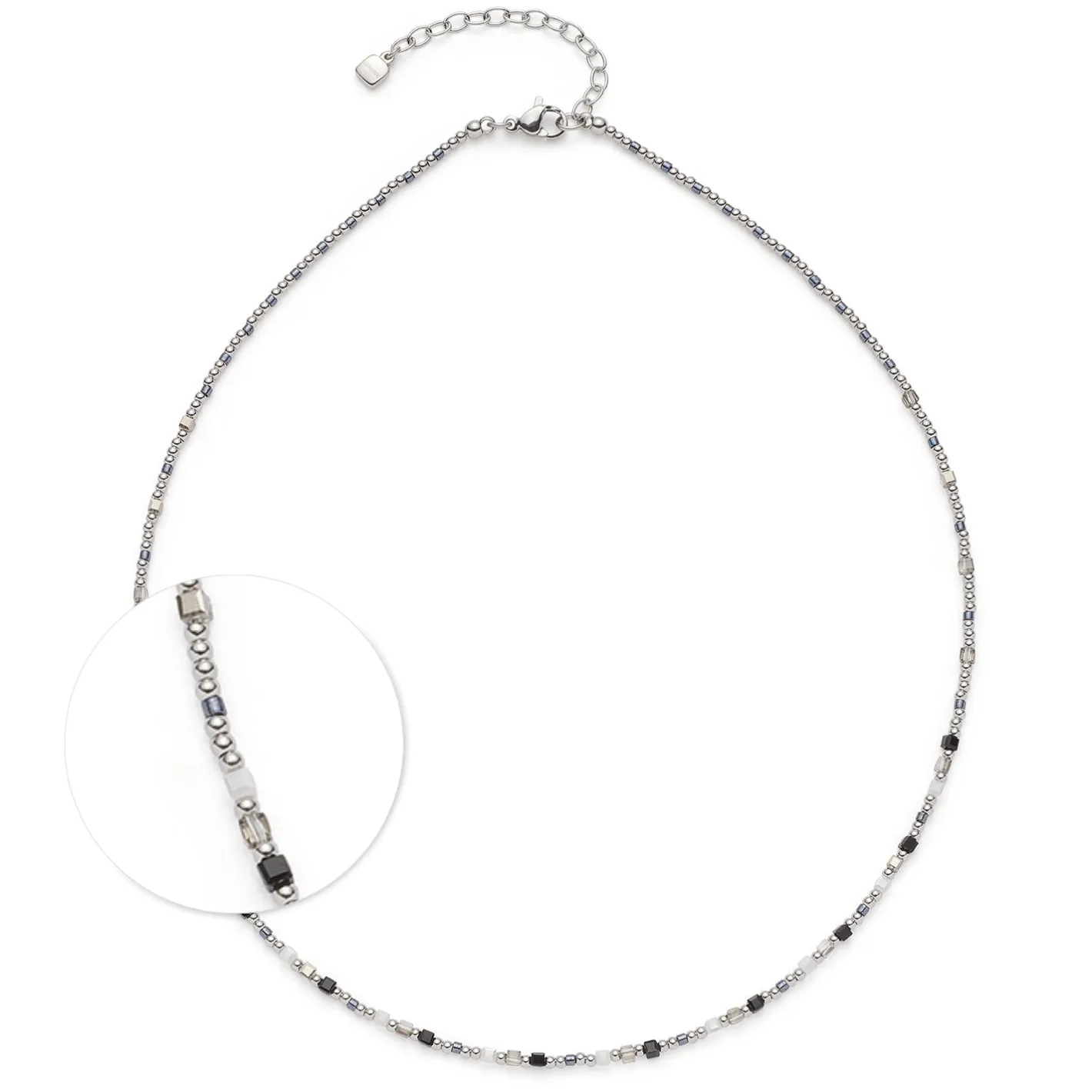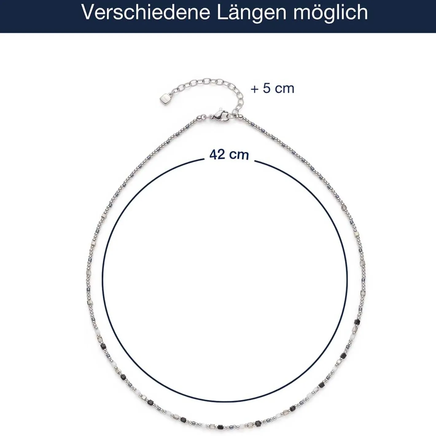 Die Halskette LIZO interpretiert den klassischen Black & White-Look auf moderne, geometrische Weise. Kleine Glaswürfel in Schwarz, Weiß und transparentem Grau reihen sich kunstvoll aneinander und werden von zarten, silberfarbenen Metallkugeln unterbrochen. Im vorderen Bereich verdichten sich die Würfel zu einem spannenden Fokuspunkt, während das Design nach hinten sanft ausläuft. Mit ihrem eleganten Farbspiel und der klaren Linienführung ist diese kurze Kette ein perfekter Begleiter für minimalistische Looks und urbane Eleganz. Der Karabinerverschluss mit Verlängerungskette sorgt für flexible Längenanpassung.