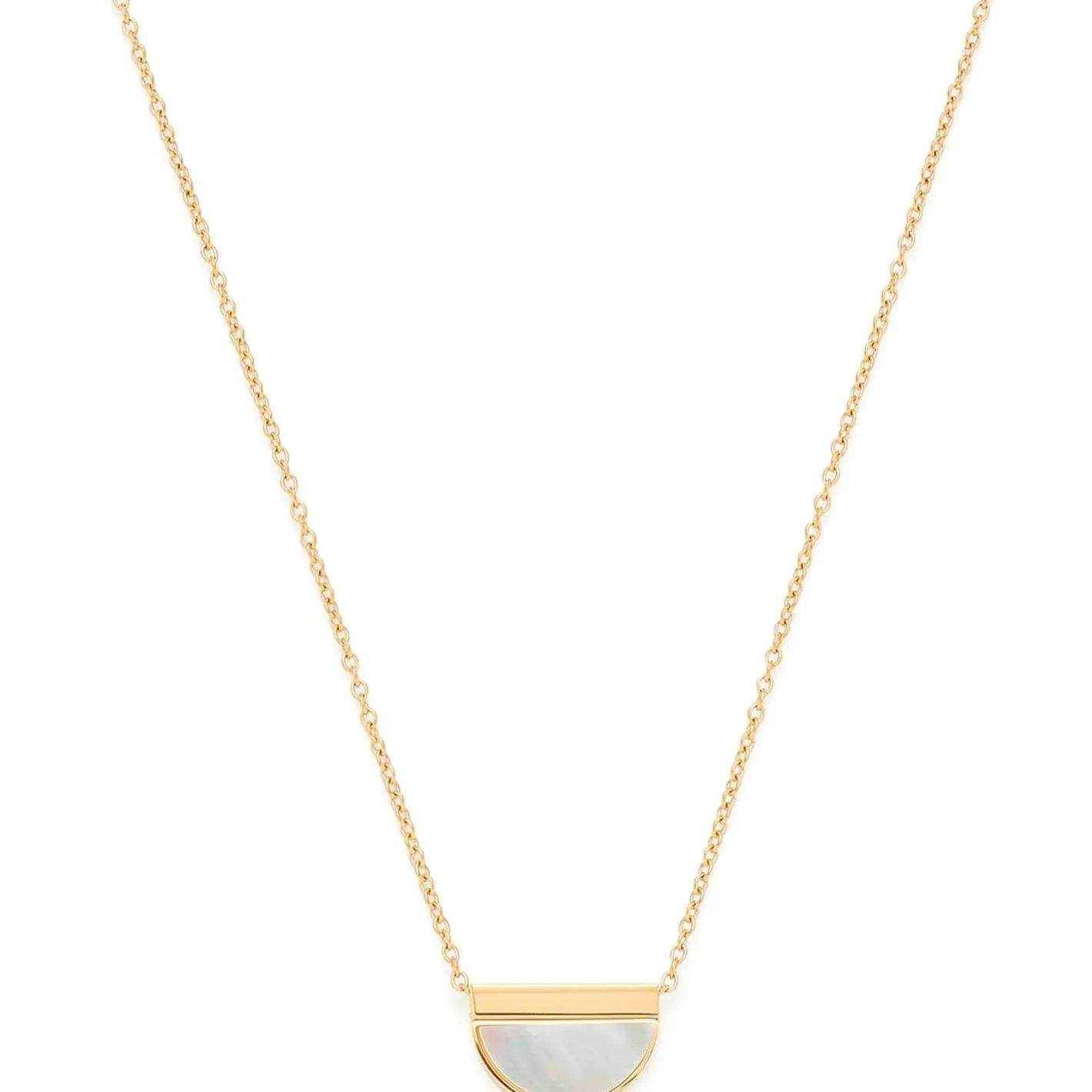 Quer getragene Anhänger, auch Crossways genannt, steigen diese Saison zum absoluten Schmucktrend empor. Dabei lässt sich das halbkreisförmige, flächige Perlmutt-Element auf dem grazil wirkenden Ankerkettchen frei bewegen. Die halsnahe Edelstahl-Kette mit goldener Ionenplattierung schließt mit Karabinerverschluss und Verlängerungskettchen, der Anhänger kann auf der Rückseite mit einer personalisierten Gravur versehen werden.