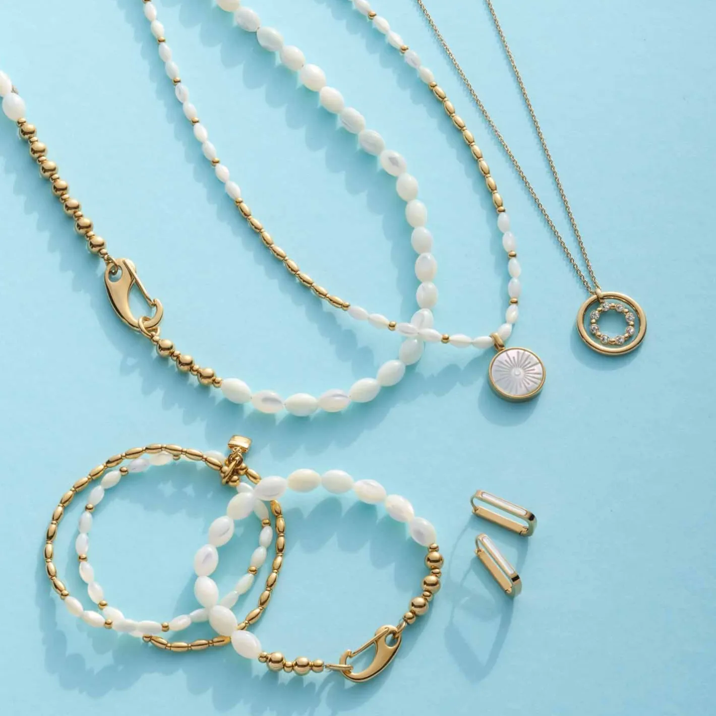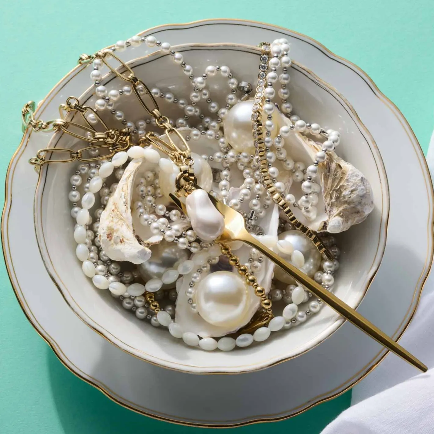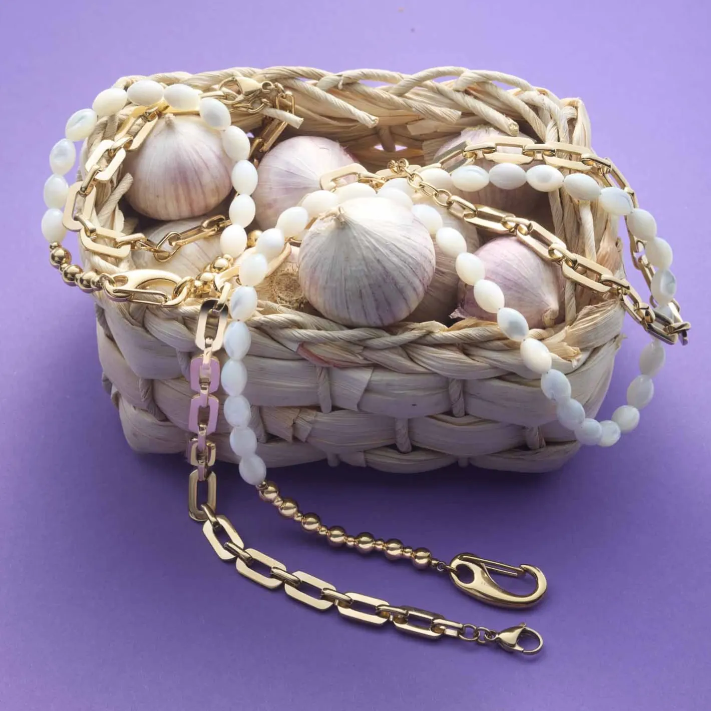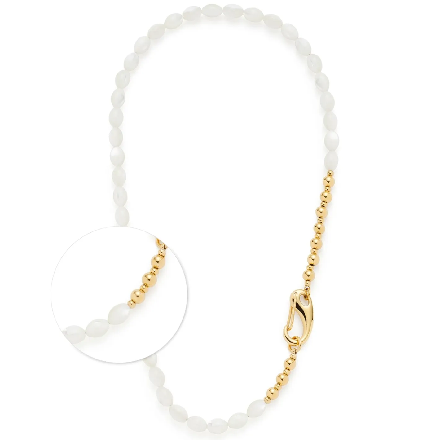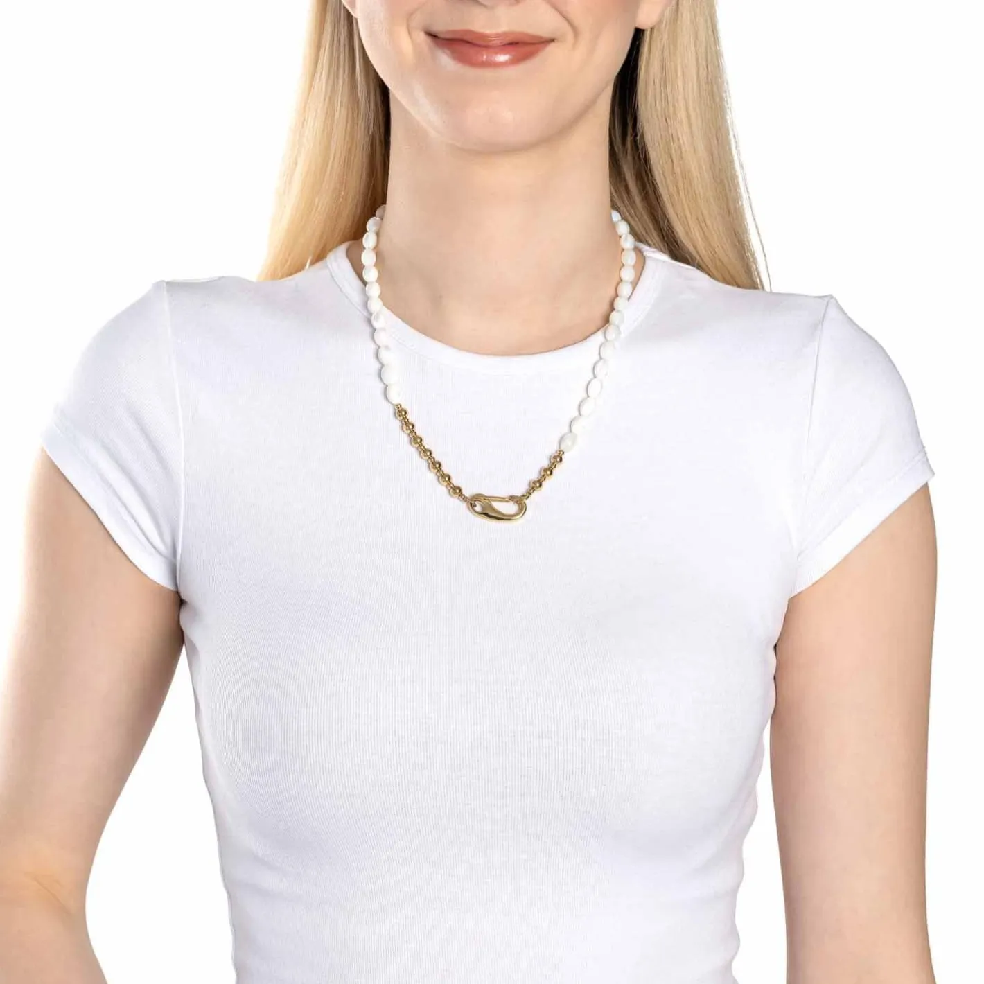 Dieses Schmuckstück ist eine moderne Fassung der klassischen Perlenkette. Weiße Muschelperlen präsentieren sich hier in Olivenform und werden mit einem großen Karabinerhaken und polierten Goldkugeln veredelt. Besonders hochwertig wirkt die Perlmutt-Optik der Perlen, während der markante Verschluss einen einzigartigen Kontrast dazu schafft. In der Kombination mit Naturtönen kann diese Kette ihre Eleganz voll und ganz entfalten.