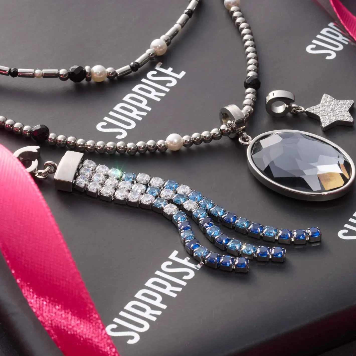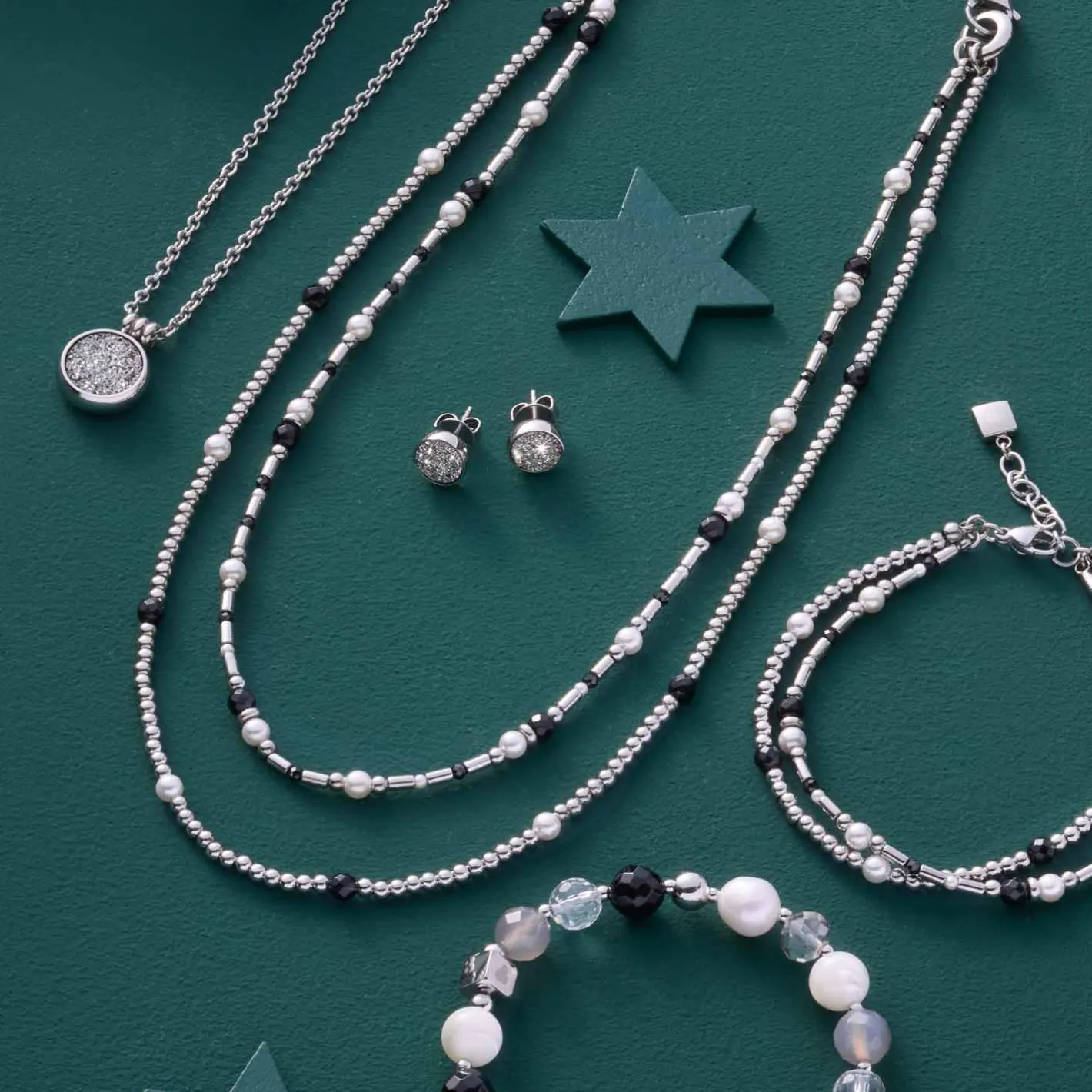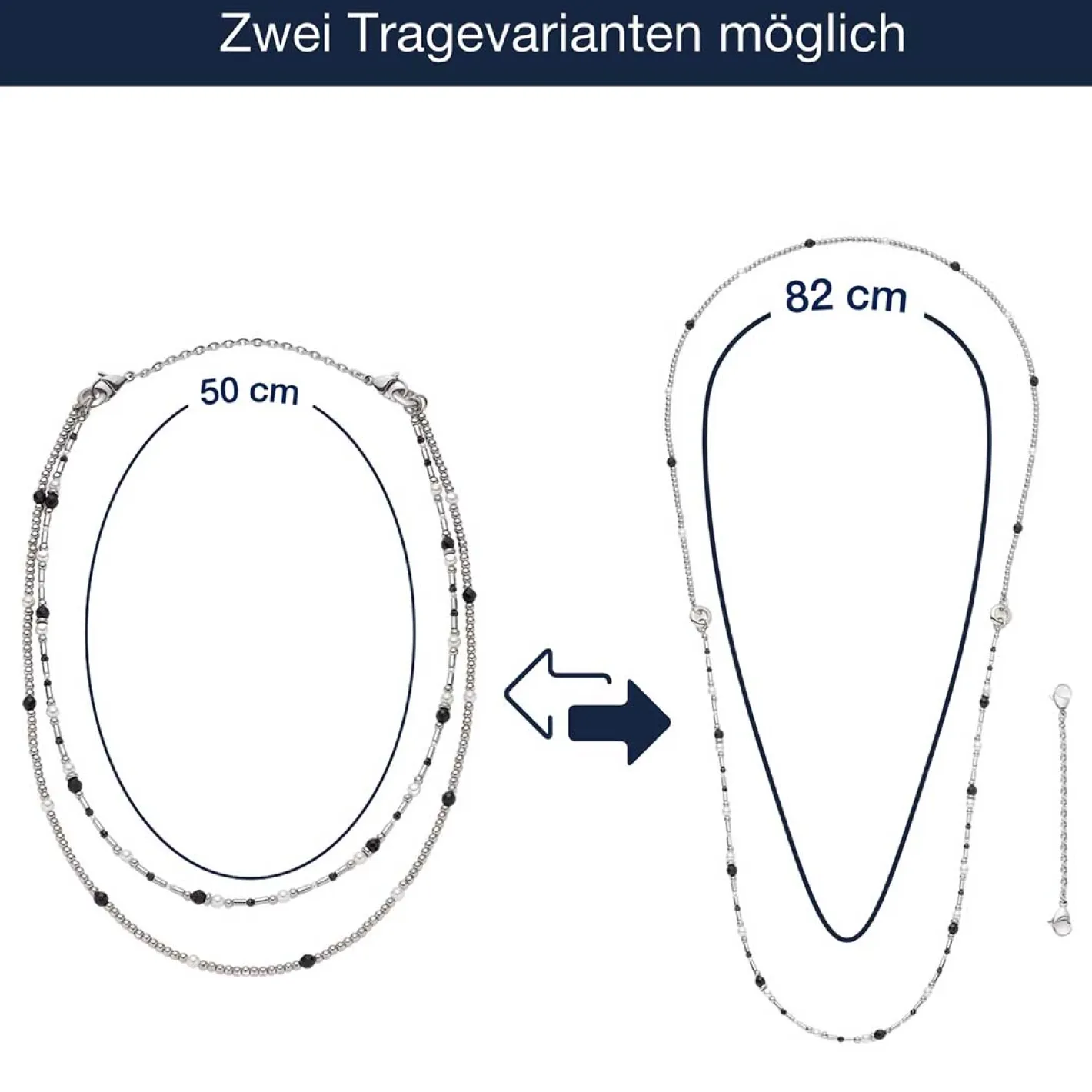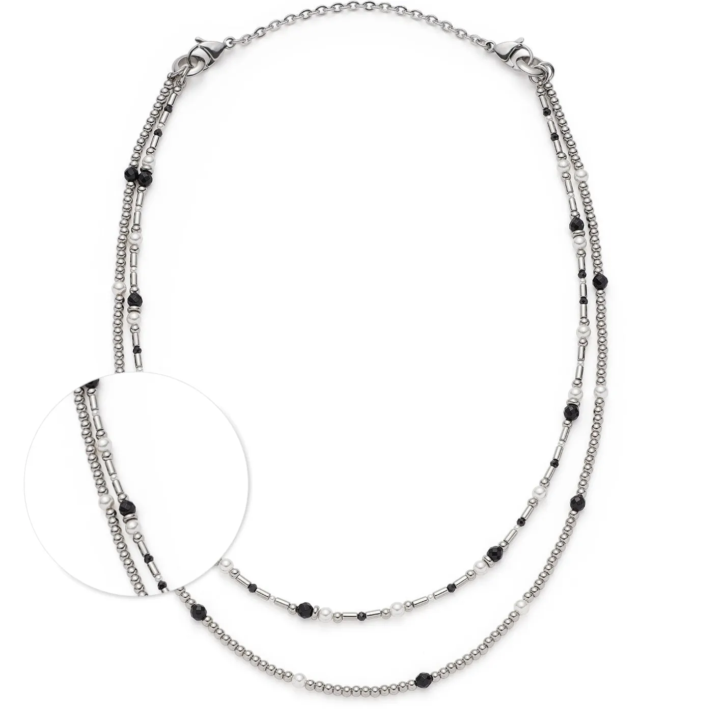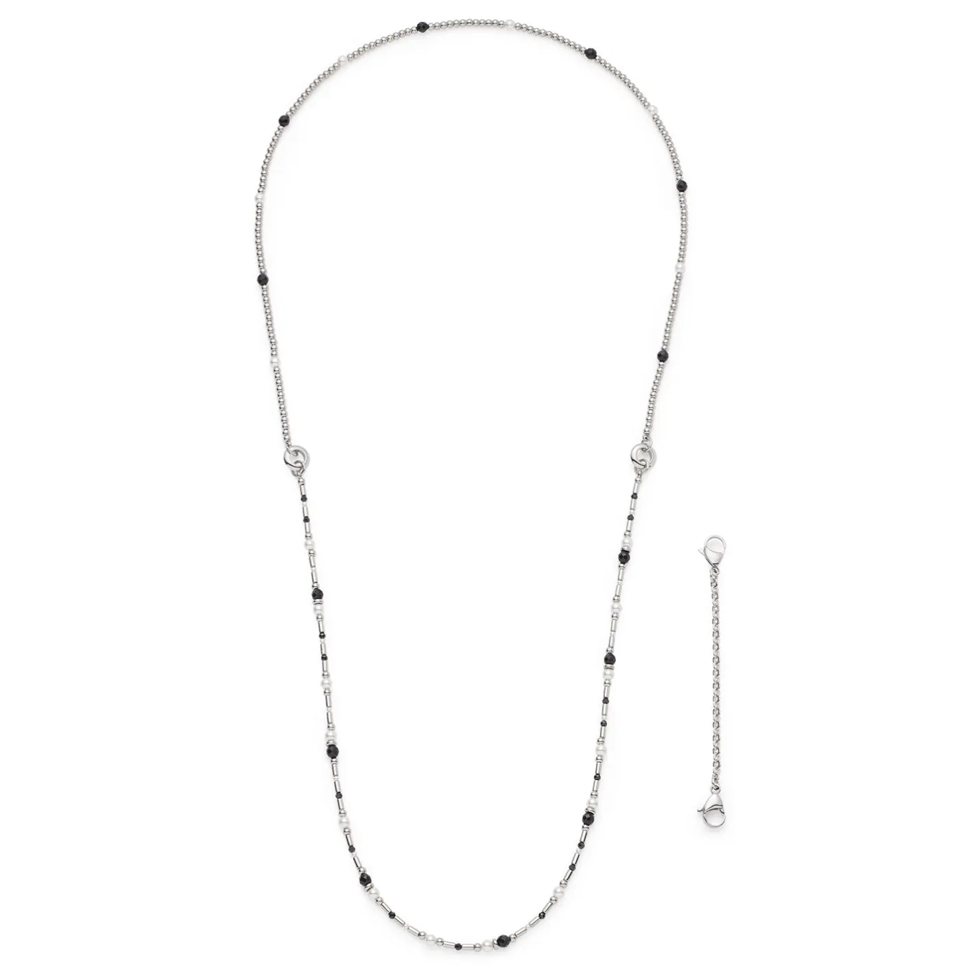 Die Halskette SABINE ist ein stilvolles Statement im klassischen Black & White Look. Silberfarbene, polierte Kugeln treffen auf facettierte, schwarze Glasperlen und natürlich wirkende, weiße Perlen. Die zwei Segmente der langen Vario-Kette sind durch markante MetallRinge verbunden, die nicht nur dekorativ sind, sondern auch Platz für Clip & Mix Anhänger bieten. Dank der flexiblen Trageoptionen kannst Du die Kette lang, doppelreihig oder individuell mit Anhängern gestalten – perfekt für vielseitige Looks von elegant bis modern.