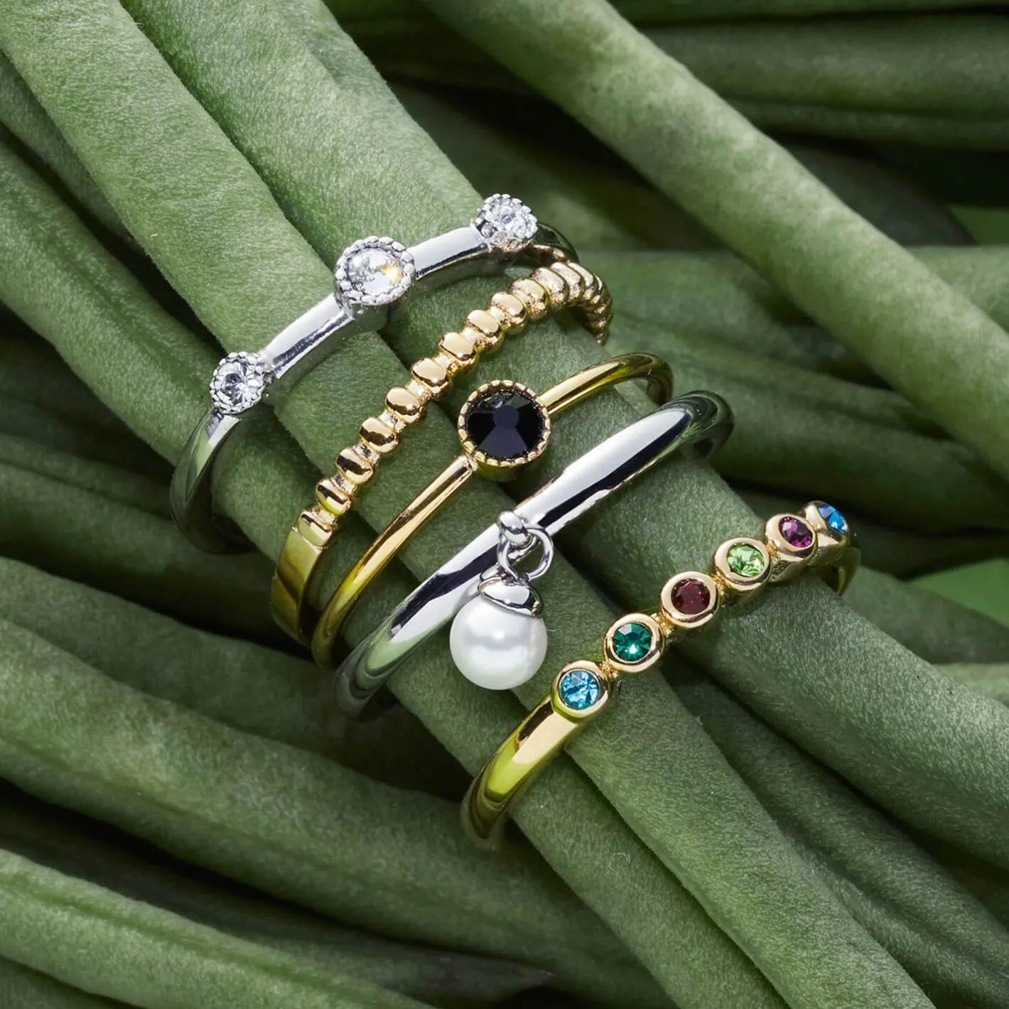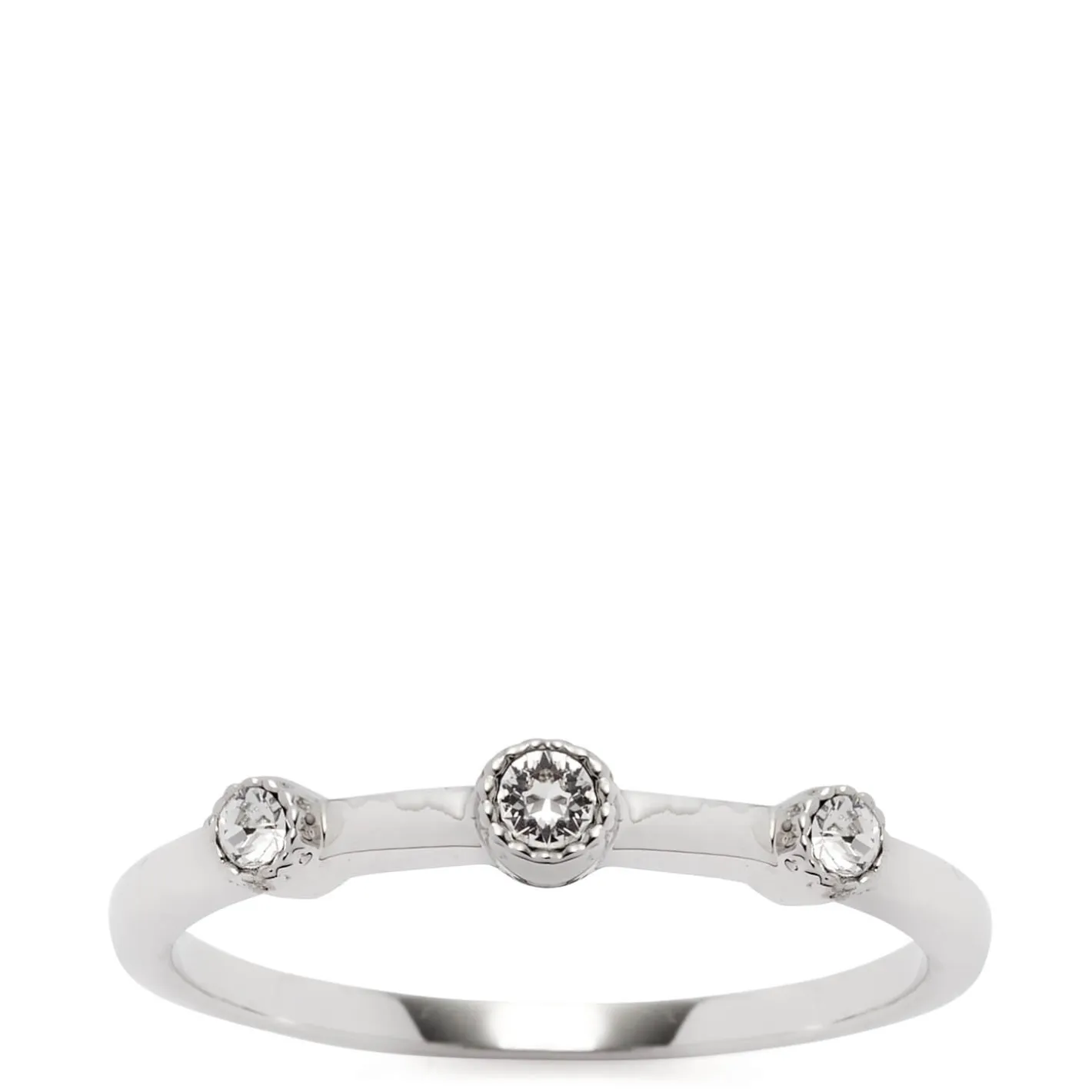 Die Zartheit dieses schmalen Rings aus poliertem Edelstahl wird von der funkelnden Eleganz facettierter Glaskristalle stilvoll unterstrichen. Feine Edelstahl-Fassungen halten die Schliffkristalle aus klarem Glas, welche raffiniert zwischen die Ringschiene eingesetzt sind.