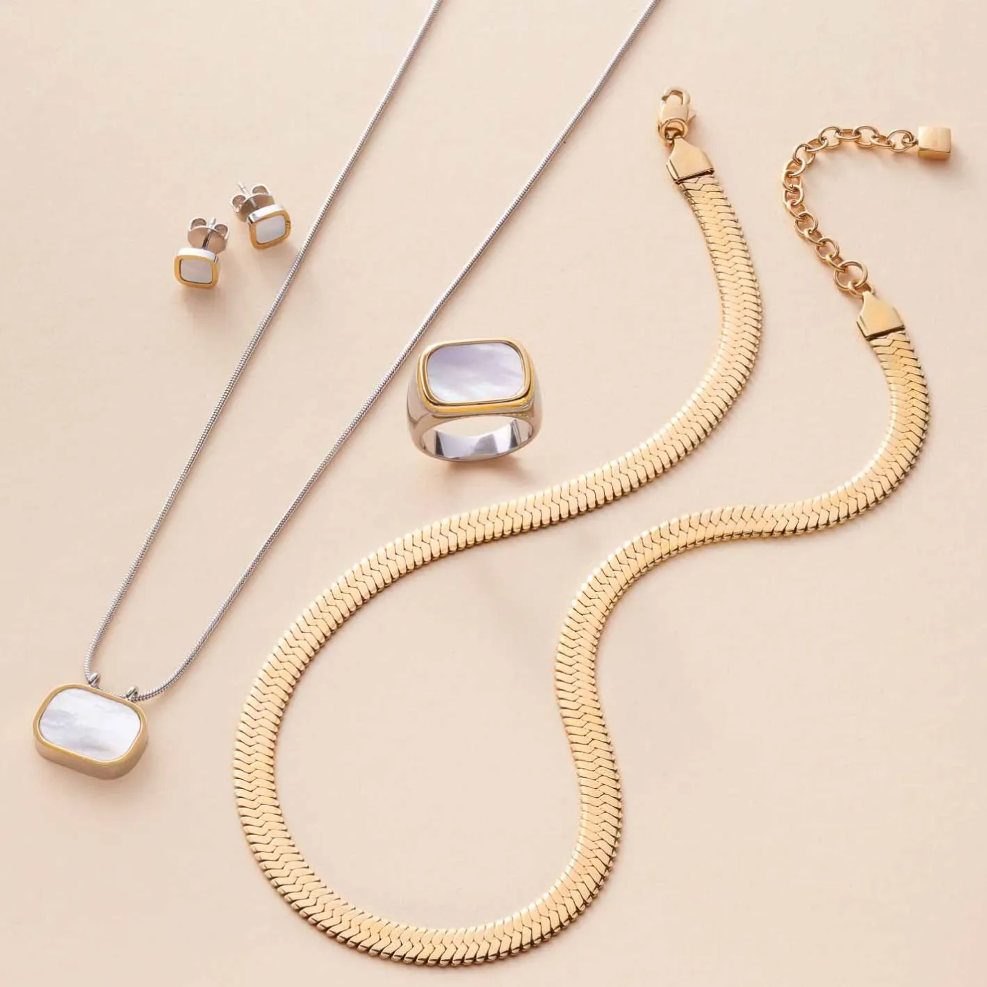 Siegelringe verleihen jedem Look ein hohes Maß an Extravaganz und setzen ein selbstbewusstes Statement. Dieser Ring aus der Serie Pirella greift das Bicolor-Thema von passender Halskette und Ohrsteckern auf und ist gleichfalls in einem stark abgerundeten Rechteck gestaltet. Dabei umspielt ein golden ionenplattierter Rand die innen ausgelegte weiße Perlmuttfläche.