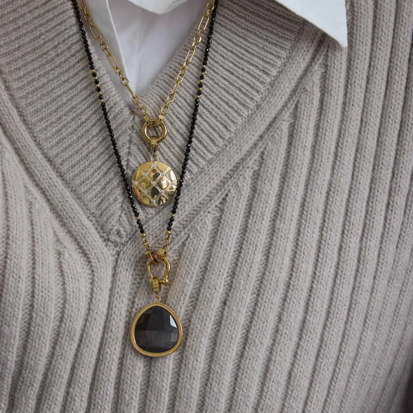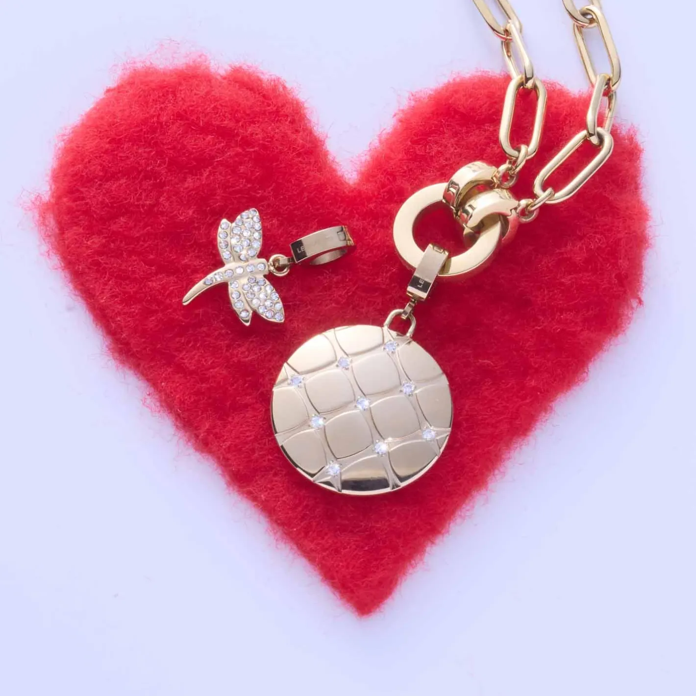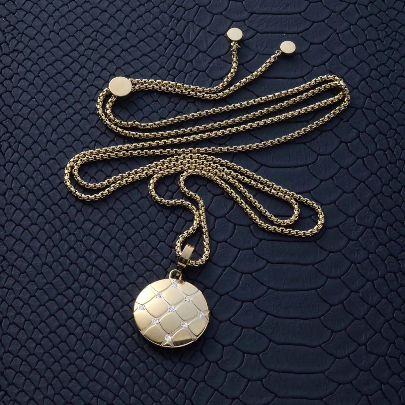 Der Anhänger COCOBELLO verbindet kunstvolles Design mit funkelnder Raffinesse. Die gewölbte, goldene Oberfläche ist von zarten Linien durchzogen, deren Schnittpunkte kleine Zirkonia-Steine zum Leuchten bringen. Ein Highlight: Der Anhänger bietet Platz für eine persönliche Gravur auf der Rückseite. Mit Clip Größe M wird COCOBELLO zum Ausdruck Deiner Individualität.