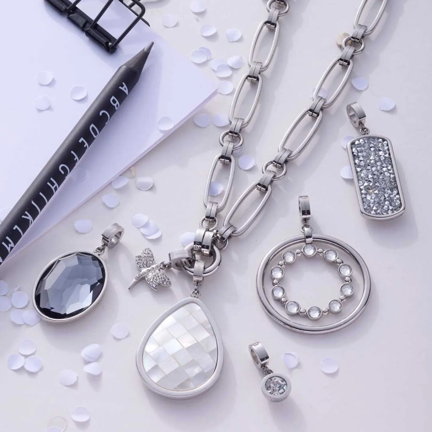 Der Anhänger EDITH vereint moderne Klarheit mit funkelnder Eleganz. Das Schmuckstück aus poliertem Edelstahl präsentiert sich in der Form eines gestreckten Rechtecks mit sanft abgerundeten Ecken – schlicht, aber wirkungsvoll. Seine Einlage aus irisierenden Glaskristallen in Weiß und hellem Grau sorgt für einen dezenten, aber luxuriösen Glanz, der sich jedem Lichtspiel anpasst. Durch den integrierten Clip in Größe M lässt sich der Anhänger mühelos an Ketten oder Armbändern der Clip&Mix-Kollektion befestigen – ideal, um individuelle Looks zu kreieren. Ob einzeln getragen oder als Teil eines Layering-Stils: EDITH bringt modernen Glamour in jedes Schmuckensemble.