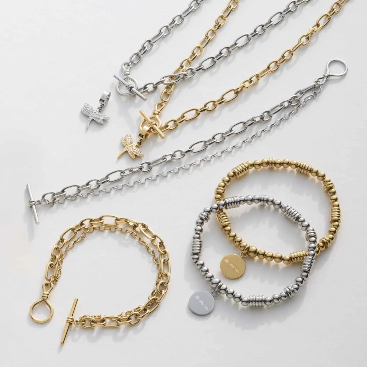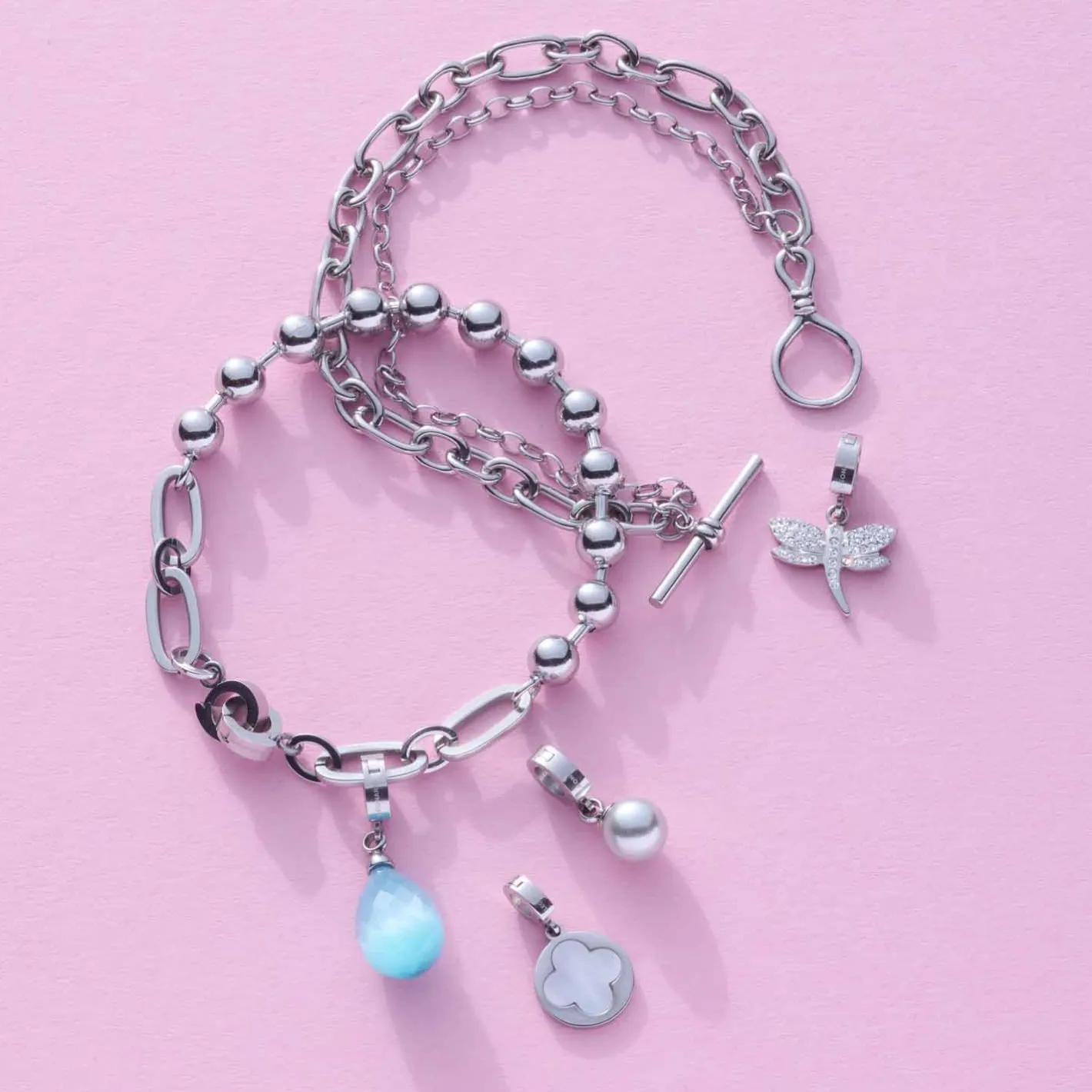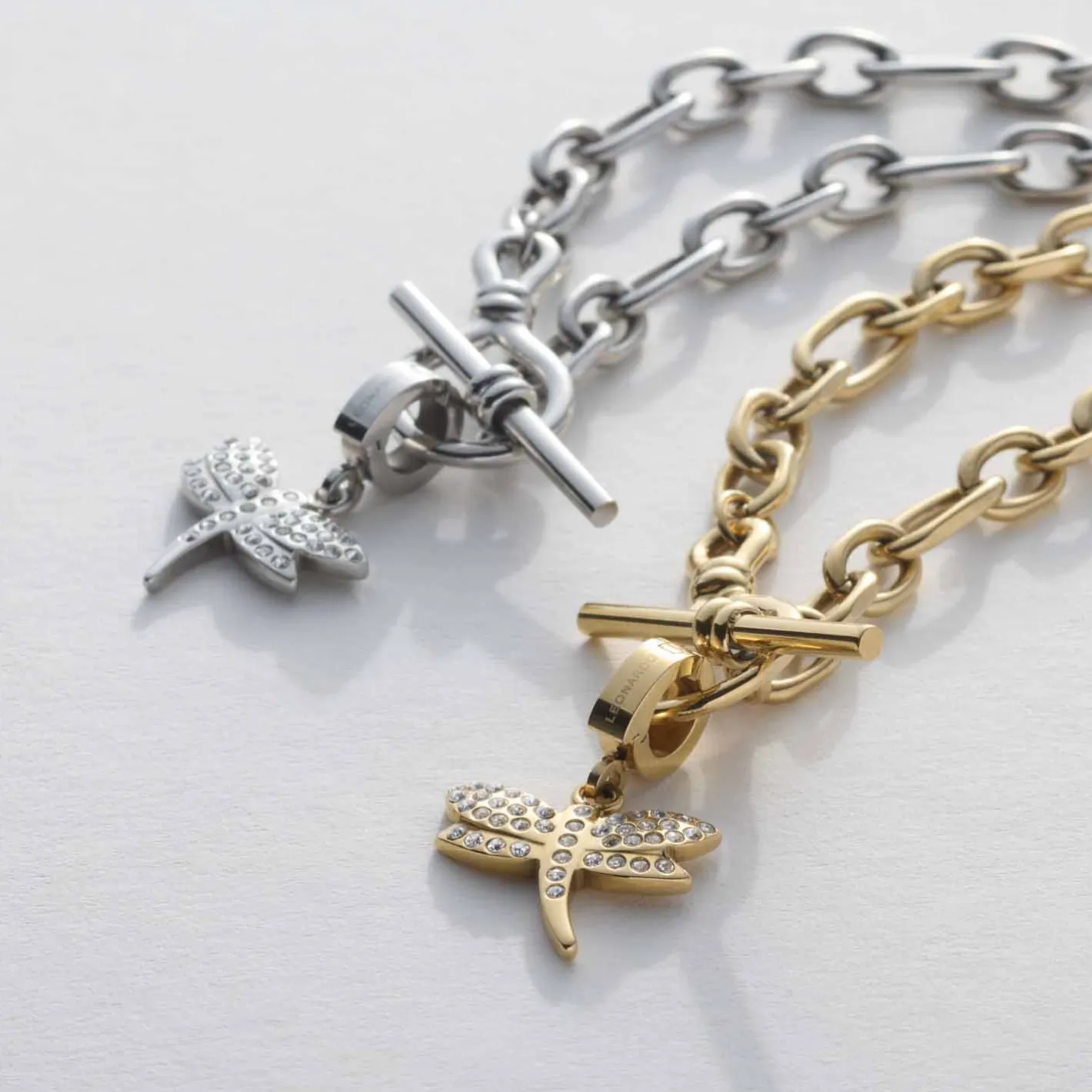 Ein Symbol für Veränderung und großen Mut – der Libellen-Charm eignet sich wunderbar für den Jahresstart. Im Gegensatz zu seiner kraftvollen Bedeutung präsentiert er sich sehr filigran und detailverliebt. Die kleine, stilisierte Libelle verzaubert mit einem funkelnden Pavé-Besatz. Kombiniere Sie im Kontrast zur kräftigen Ankerkette aus der gleichen Serie oder zu zarten Silberketten. Zum Fixieren dient ein M-Clip.