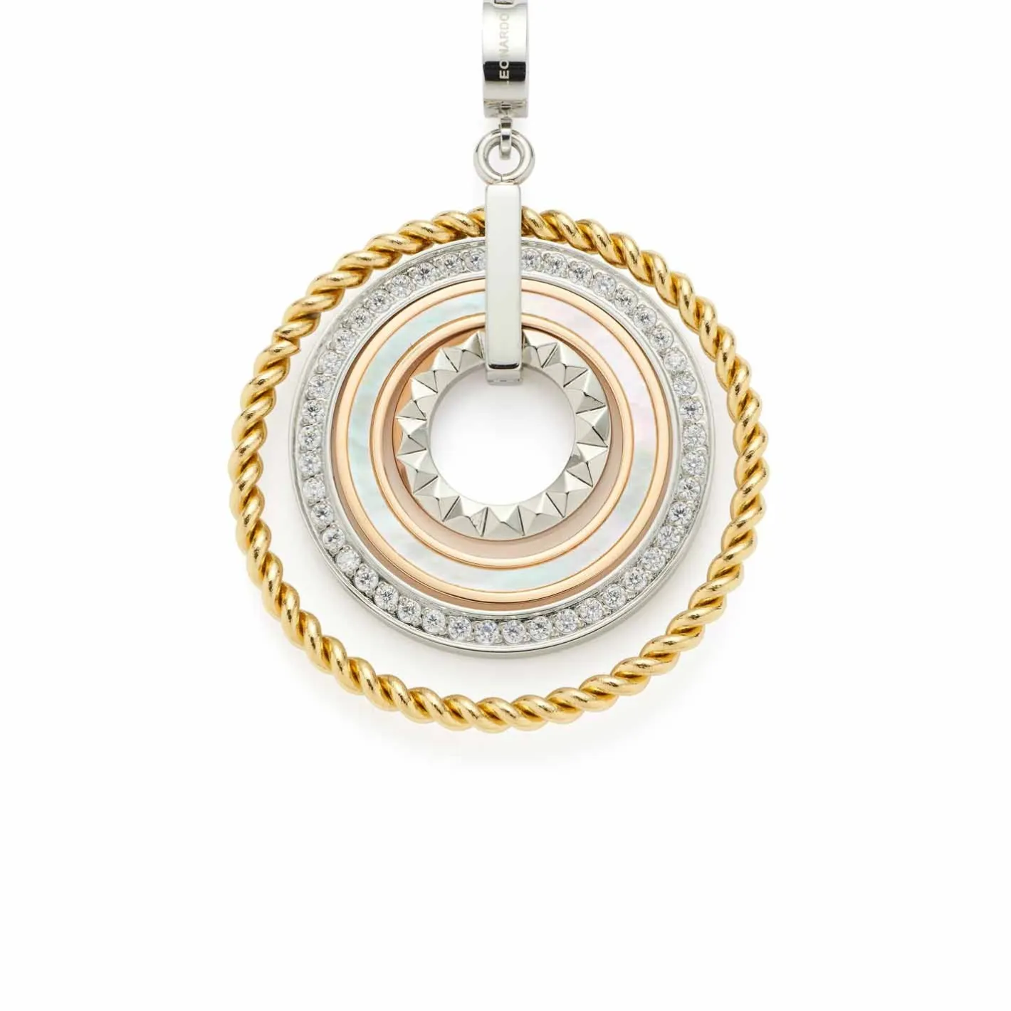 Kordel-Strukturen, natürliches Perlmutt, klare Zirkoniasteinchen und aneinander gesetzte Edelstahl-Nieten ergeben ein Zusammenspiel der besonderen Art. Ein Design, dass zweimal hingucken und jeder Halskette einen spannenden Eyecatcher zuteilwerden lässt.
