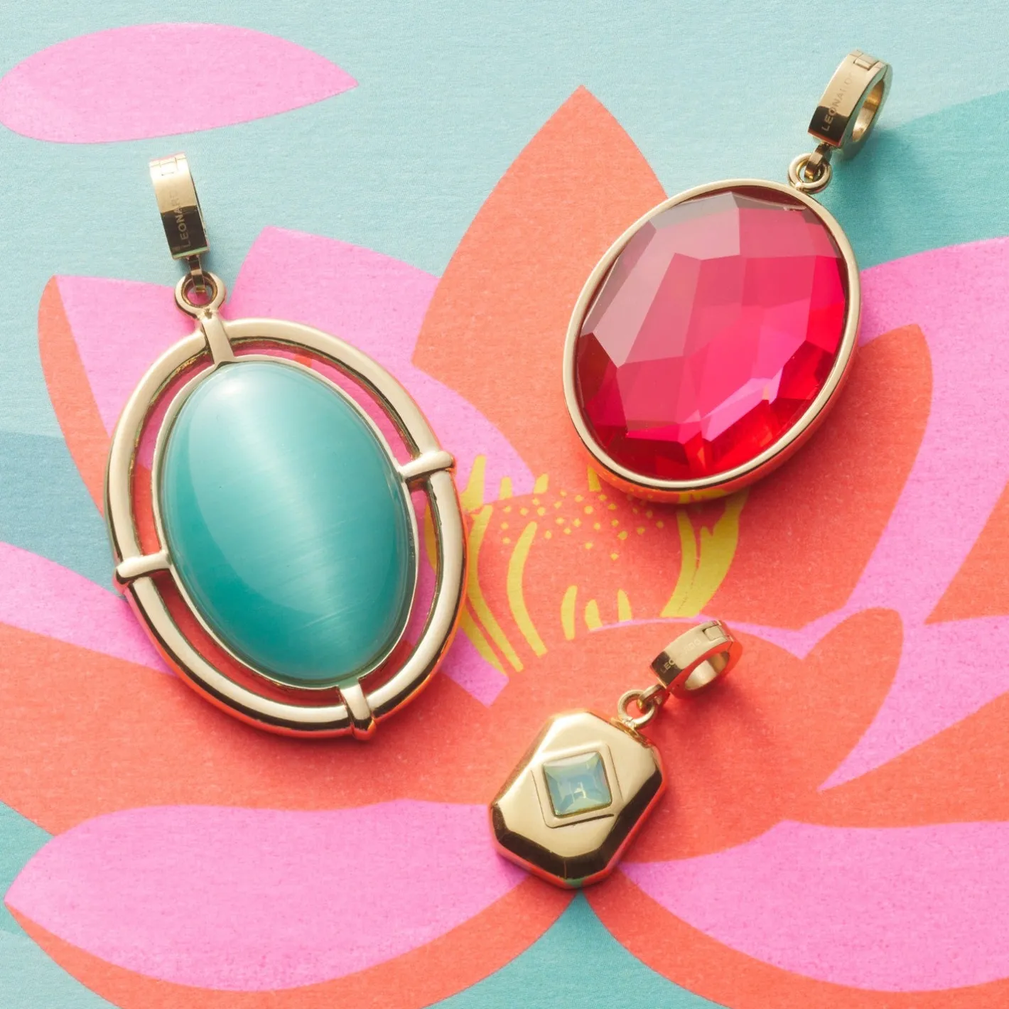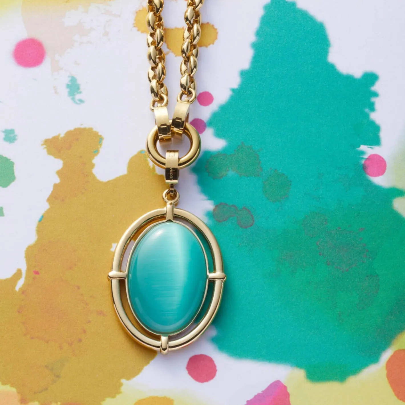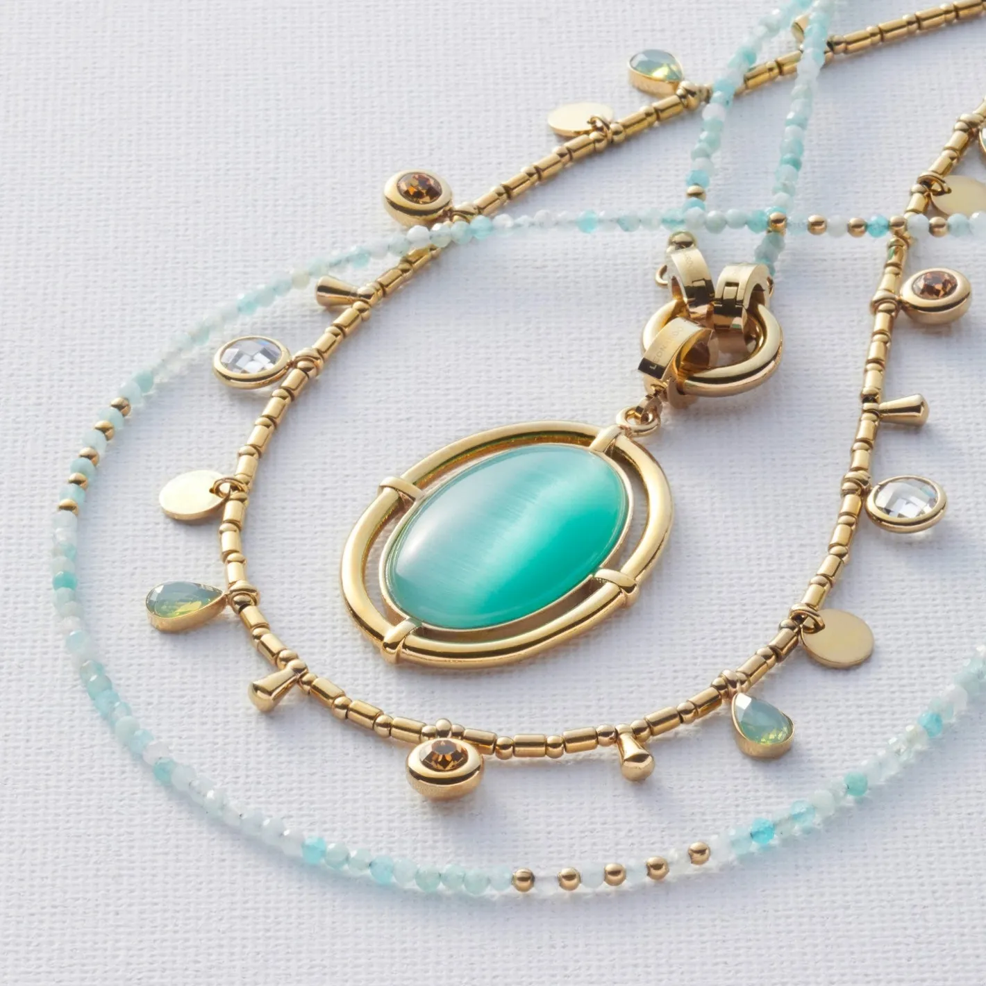 Sommerlich präsentiert sich der große, ovale Anhänger in den Farben des Meeres, strahlend kombiniert mit golden ionenplattiertem Edelstahl. Der Hauptakteur: ein weich gerundeter Cateye-Stein in einem kühlen Aqua-Ton, gehalten in einer geschlossenen Fassung. Diese wird von feinen Verbindungsstegen in einem offenen, abgerundeten Rahmen luftig getragen – ein Design, das dem Heritage-Trend entspringt. Mit der Halskette Pippa im gleichen Aqua-Ton wird es besonders harmonisch.