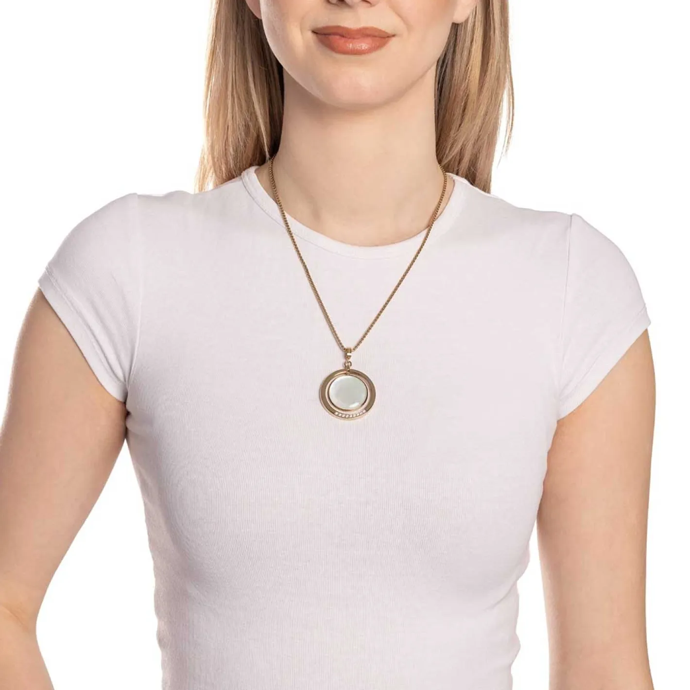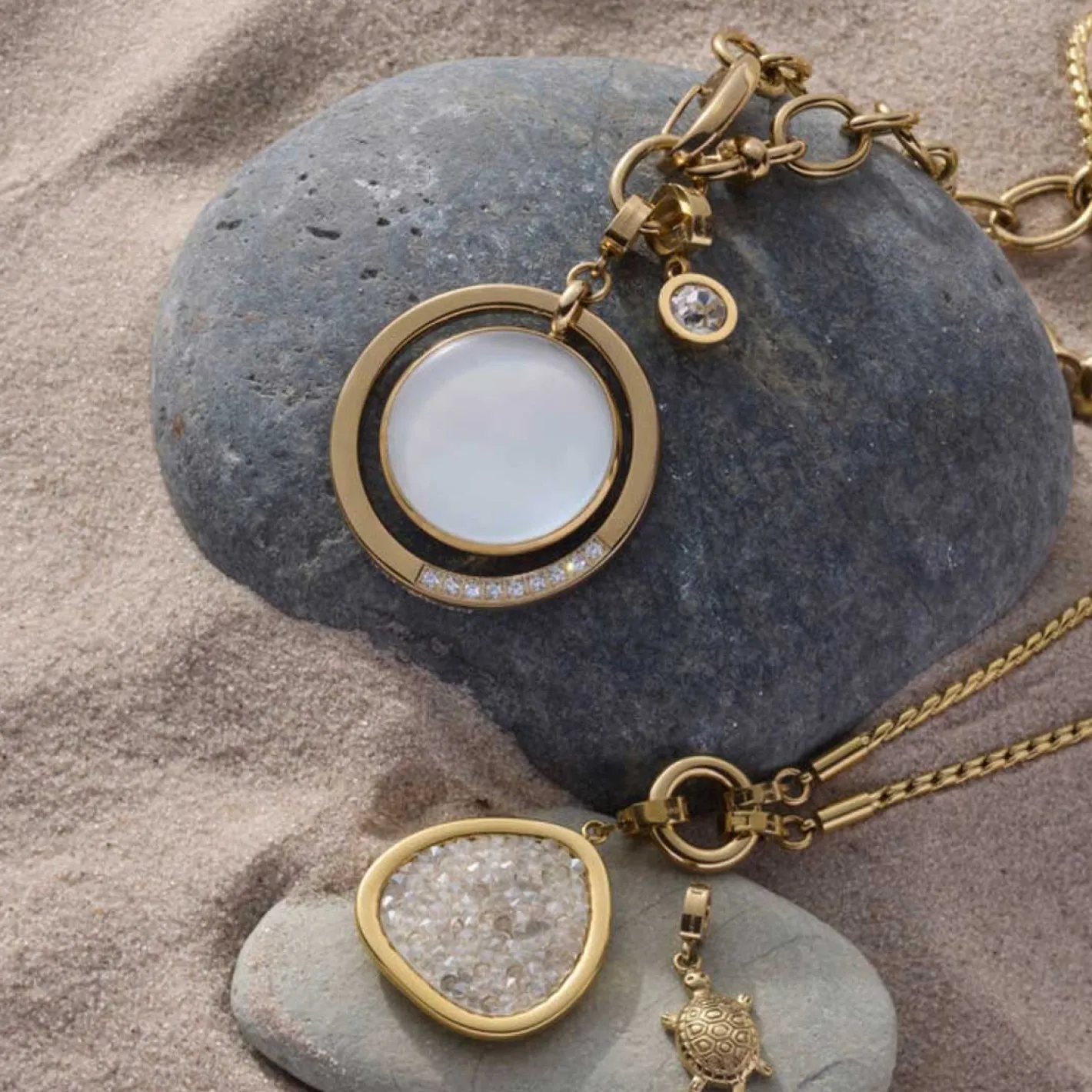 Der Anhänger MAGDA ist ein modernes Statement-Piece mit markanter Präsenz. Der große Anhänger aus poliertem, goldfarbenem Edelstahl besteht aus zwei beweglichen Elementen, die für besondere Dynamik sorgen. Das Design kombiniert einen offenen Ring mit eckigem Querschnitt und einem funkelnden Pavé-Besatz, der für luxuriöse Lichtreflexe sorgt. In der Mitte strahlt ein runder, schimmernder Perlmuttstein, der dem Schmuckstück seine edle, natürliche Note verleiht. Durch den integrierten Clip in Größe M lässt sich MAGDA mühelos an verschiedenen Basis-Ketten oder -Armbändern befestigen und nach Lust und Stil kombinieren. Perfekt für alle, die Eleganz mit einem Hauch Extravaganz verbinden möchten.