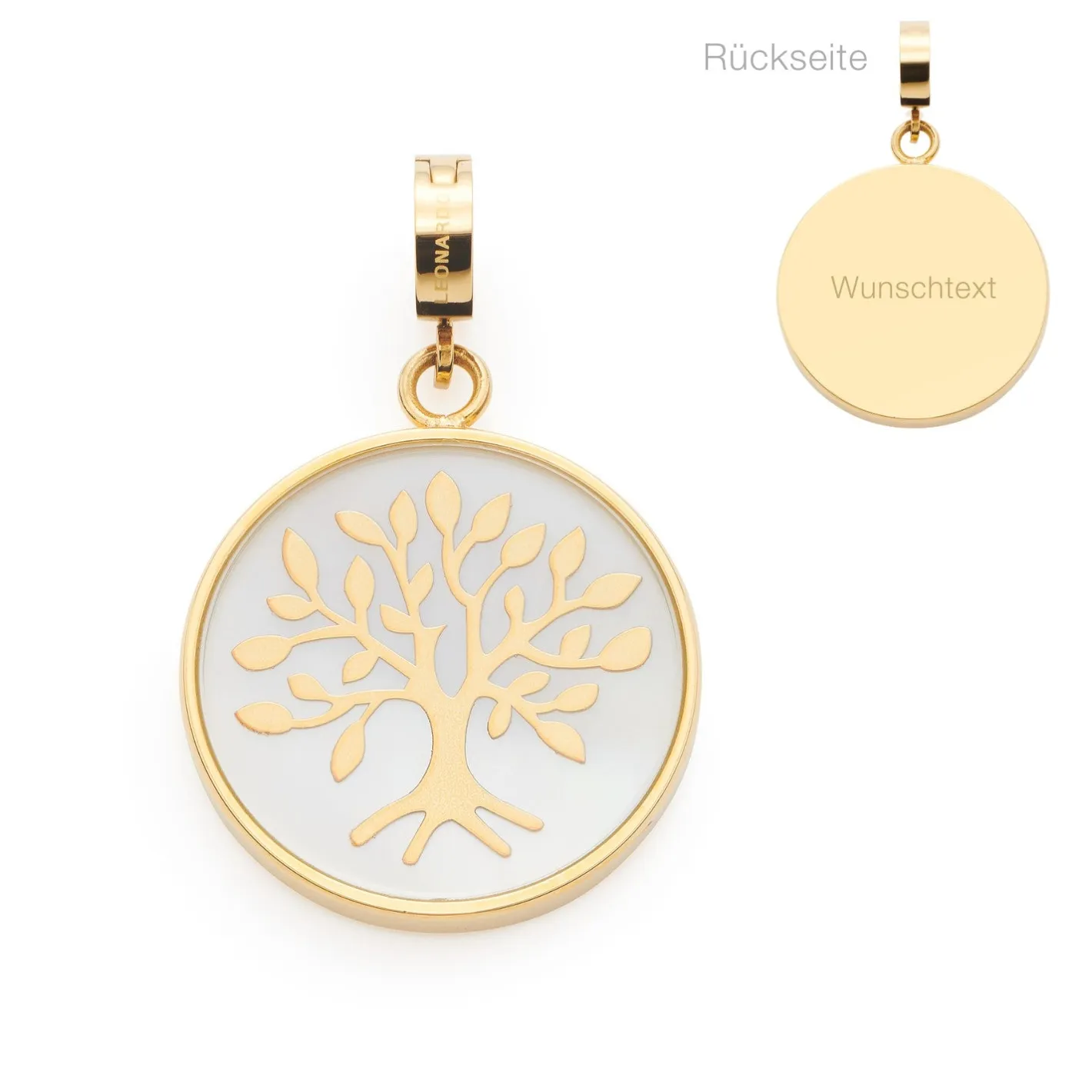 Das Motiv des Lebensbaums fasziniert immer wieder. Kein Symbol steht mehr für das Leben. Durch die weiße Perlmuttscheibe und den goldenen Edelstahl ist dieser aussagekräftige Anhänger aber auch ein richtiger Eyecatcher. Die Rückseite bietet sich an für eine ganz persönliche Gravur.