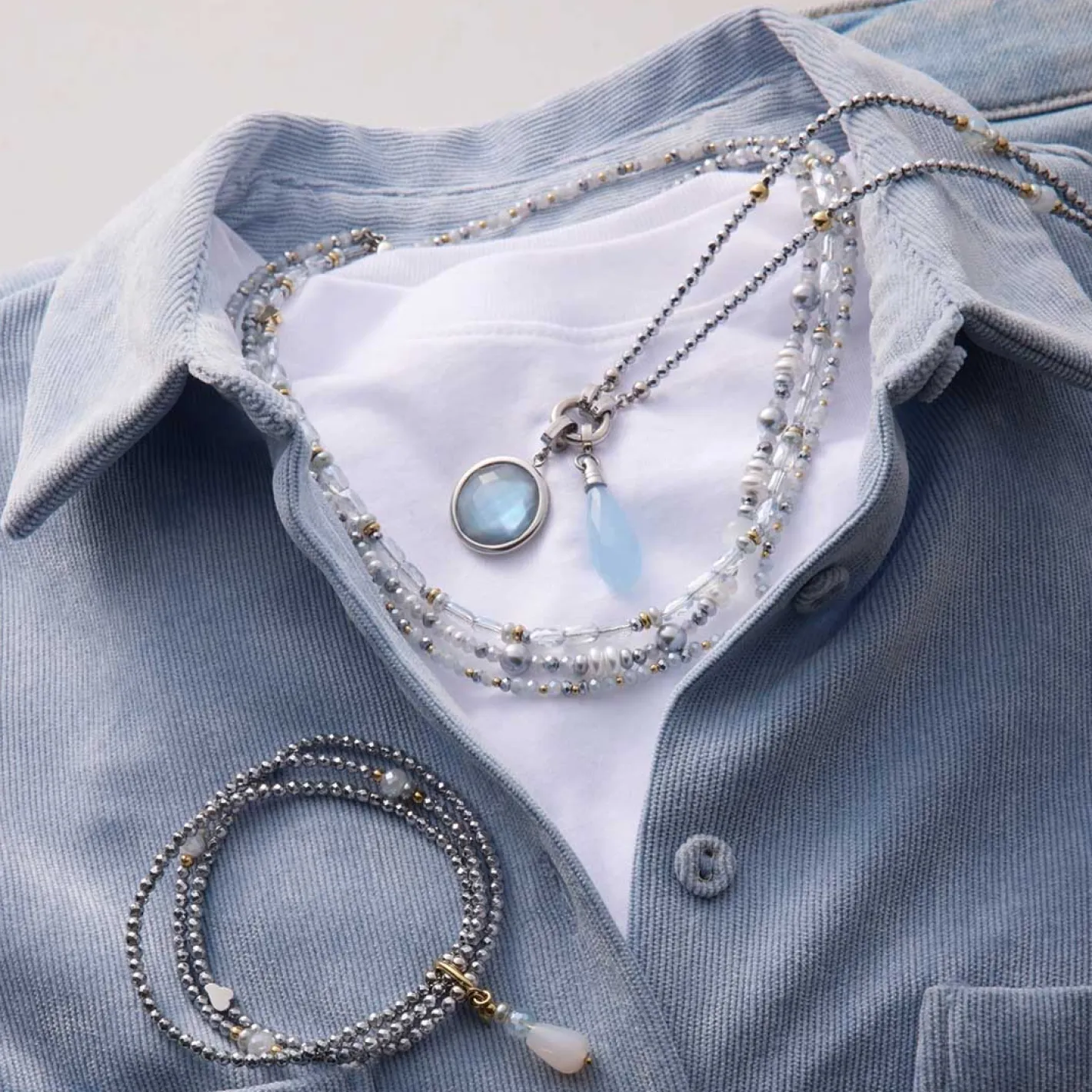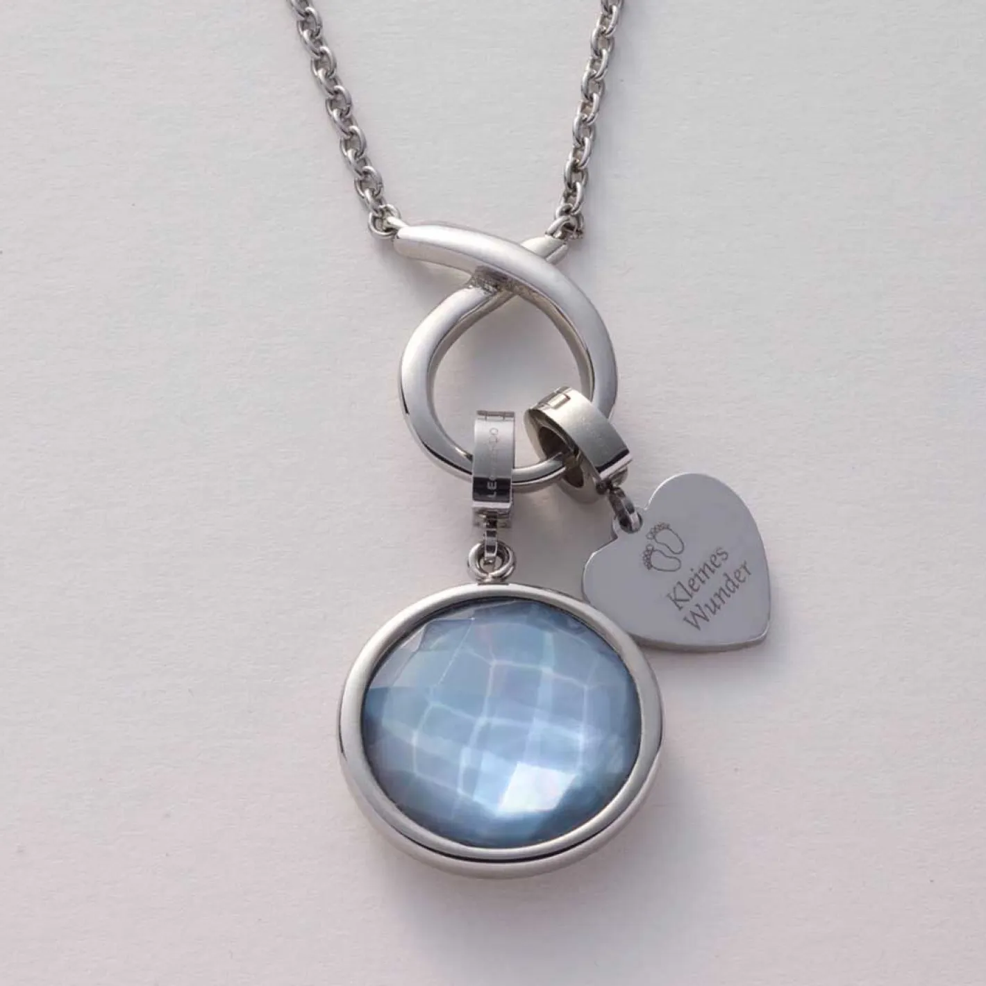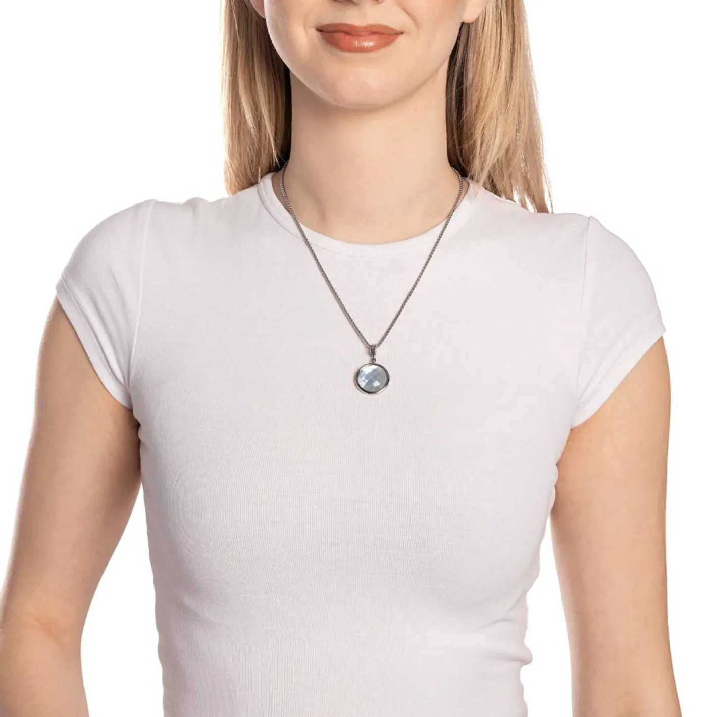 Der Anhänger MINKA begeistert durch seine dezente Eleganz und das harmonische Farbspiel. Der runde Anhänger aus poliertem Edelstahl kombiniert einen facettierten Glasstein in pastellblaugrau mit einer zarten Perlmutt-Unterlage, die für besondere Tiefe und sanft schimmernde Lichtreflexe sorgt. Die hochwertige Fassung betont den modernen, reduzierten Stil des Schmuckstücks und macht MINKA zu einem vielseitigen Begleiter – sowohl für den Alltag als auch für besondere Momente. Dank des Clips in Größe M lässt sich der Anhänger einfach an passenden Basis-Ketten oder -Armbändern befestigen und flexibel kombinieren.