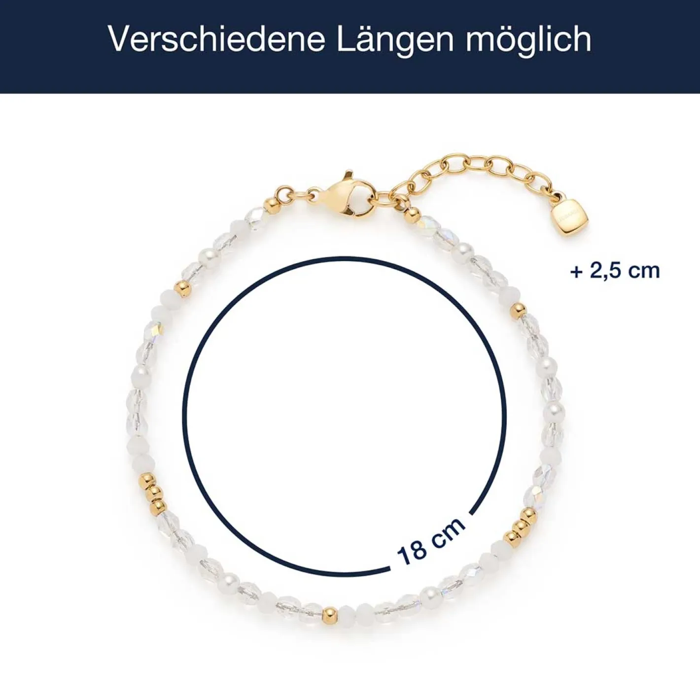 Das Armband ALTHINA vereint harmonische Farben und hochwertige Materialien in einem eleganten Design. Inspiriert vom Romantic-Trend besteht es aus poliertem Edelstahl mit goldfarbener Veredelung und kombiniert glitzernde, transparente Glasperlen, natürlich wirkende weiße Perlen und feine Goldkugeln zu einem ausgewogenen Gesamtbild. Der sanfte Wechsel der Elemente verleiht dem Armband eine moderne Leichtigkeit und einen Hauch von zeitloser Raffinesse. Dank Karabinerverschluss mit Verlängerungskette lässt sich die Passform individuell anpassen. Das Armband ALTHINA ist das ideale Accessoire für jeden Tag und lässt sich wunderbar mit der passenden Kette ALTHINA kombinieren – für ein stilvolles Gesamtbild mit dezentem Glanz.