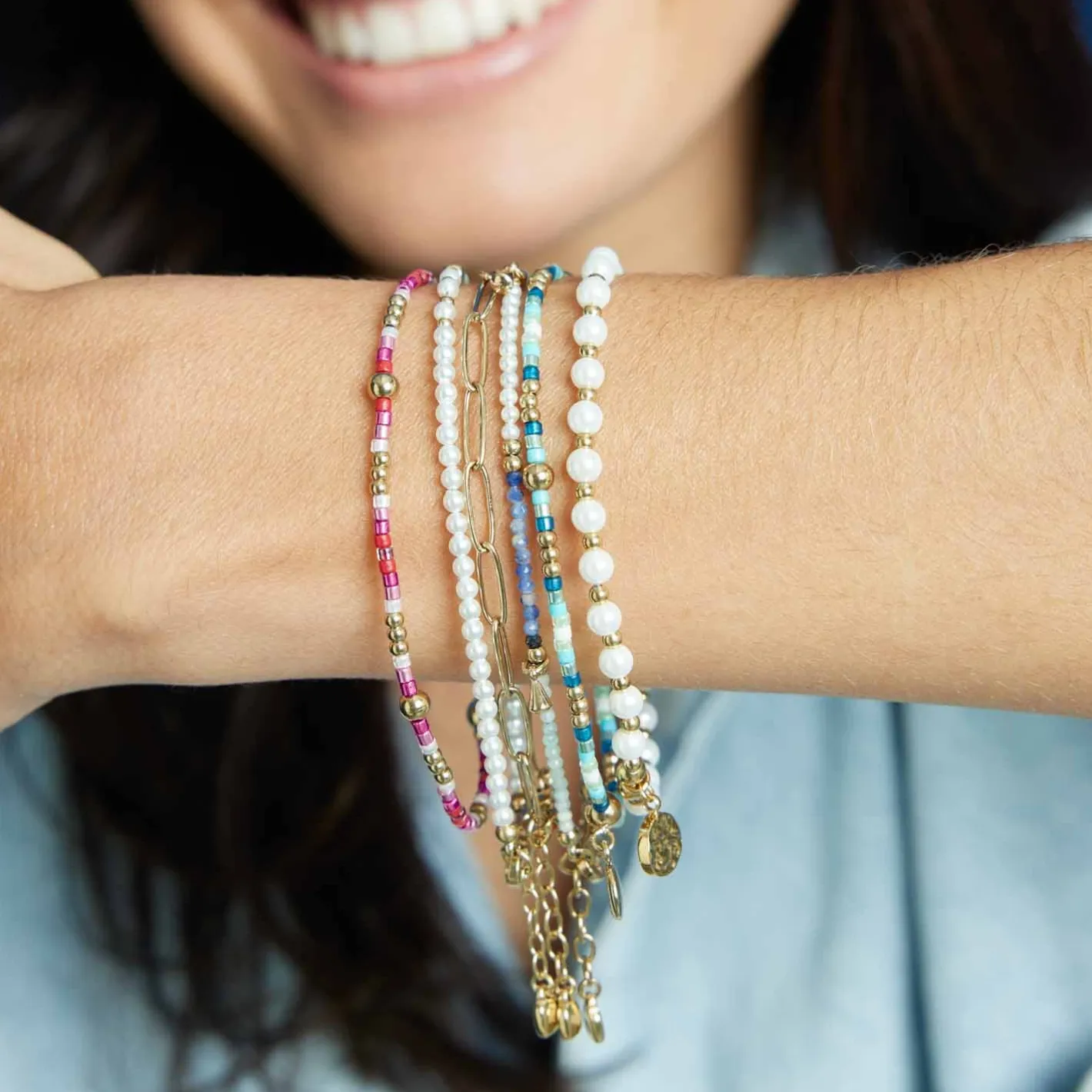 Das Armband ergibt in der Kombi mit der passenden Kette Babelli ein modern-elegantes Ensemble. Ähnlich wie bei der Kette reihen sich beim Armband auch blaue, türkisfarbene und blass-rosa/graue Natursteinchen sowie weiße Imitationsperlen aneinander. Dazwischen zeigen sich mehrere Goldtropfen, die den zarten Look unterstreichen. Dank des Karabinerverschlusses und der Verlängerungskette passt sich das Armband perfekt an.