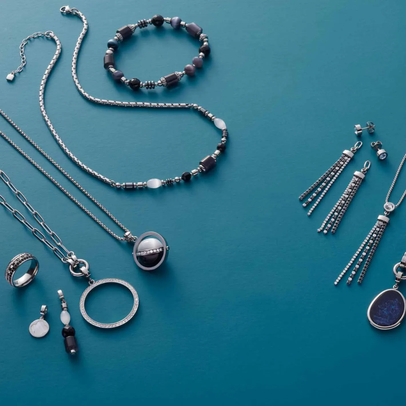 Dieses Armband spielt mit einem schönen Mix aus unterschiedlichen Perlen diverser Formen. Zylinder, Ellipsen, Oliven aus Glas, Catseye und Hämatit wechseln sich stilvoll ab. Dazwischen finden sich kleine Kugeln aus Edelstahl. Farben von Hellgrau bis Schwarz machen den zeitlosen Look perfekt. Dank des elastischen Bands lässt sich das Armband einfach über die Hand streifen.