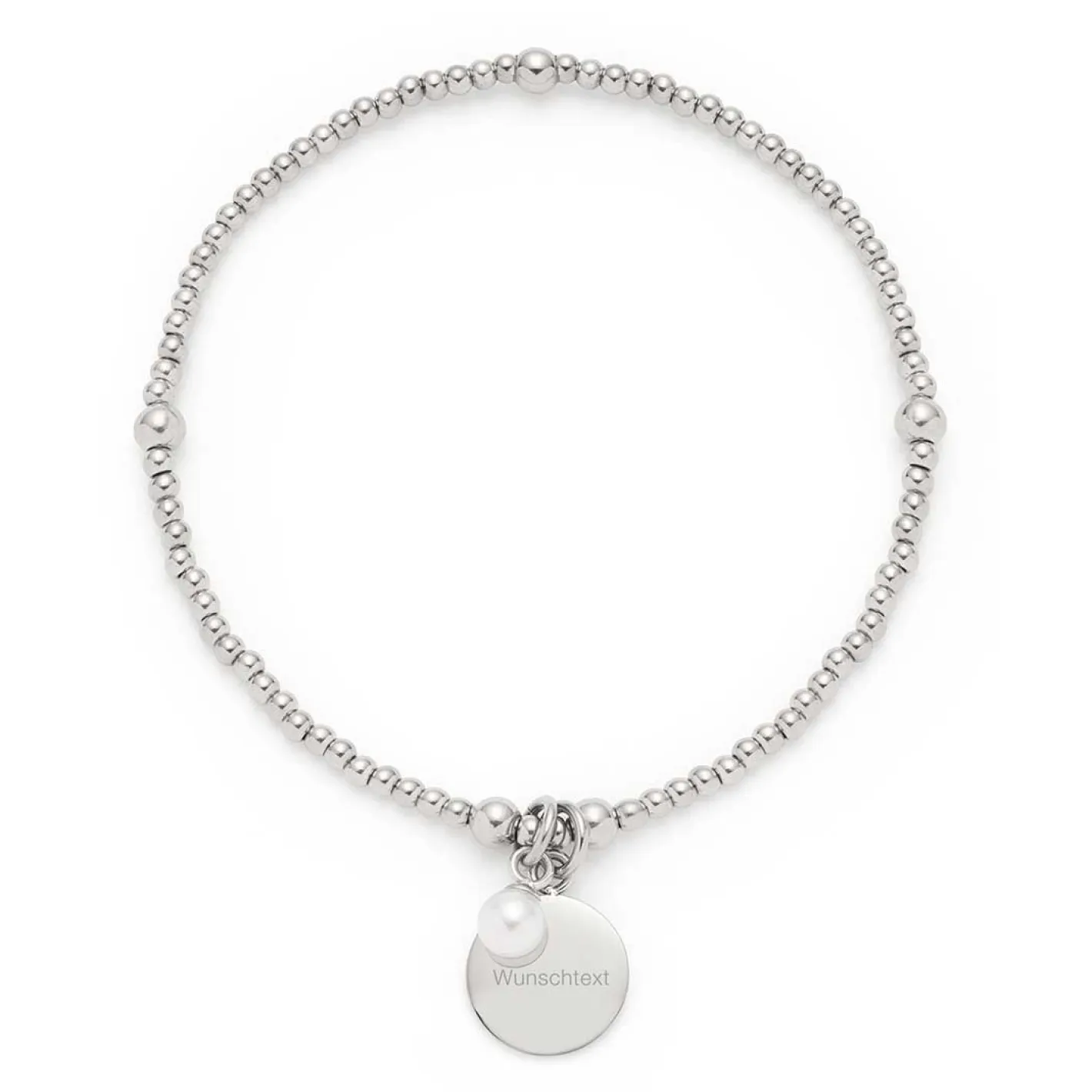 Das Armband DEBBY ist ein eleganter Allrounder, der schlichte Raffinesse mit liebevollen Details verbindet. Die feinen, gereihten Metallkugeln aus poliertem Edelstahl verleihen dem Zugarmband einen modernen Look, der sich angenehm an dein Handgelenk schmiegt. In regelmäßigen Abständen unterbrechen größere Kugeln das Design und setzen stilvolle Akzente. Zwischen zwei dieser Kugeln befindet sich eine zarte, weiße Perle und eine runde Gravurplatte, die auf beiden Seiten Platz für eine persönliche Gravur bietet. So wird das Armband zu einem individuellen Schmuckstück mit emotionalem Wert. Das flexible Zugband sorgt für hohen Tragekomfort und macht das Armband DEBBY zu einem Lieblingsaccessoire für jeden Tag – elegant, modern und mit persönlicher Note.
