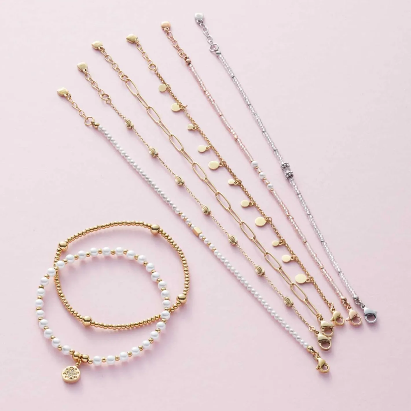 Kleine Imitationsperlen und winzige Edelstahl-Elemente in runder Form reihen sich dicht aneinander und ergeben zusammen dieses charmante Armband für sowohl minimalistische Basic-Styles als auch für schicke Abend-Garderoben. Vor allem mit dem passenden Collier erweist sich dieses Schmuck-Set als ideale Begleitung für elegante Kleider oder Blusen-Rock-Ensembles.