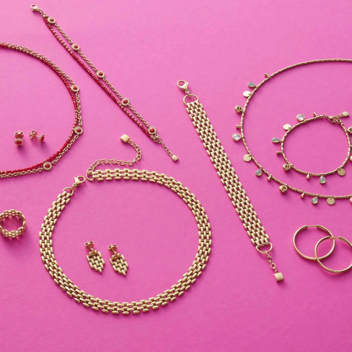 Das doppelreihige, kontrastvolle Design schenkt diesem Armband echten Trend-Charakter. Feine, dunkelrote Glasperlen und zarte, goldene Edelstahlkügelchen bilden einen Strang des Ensembles. Den anderen Strang macht eine klassische Ankerkette aus, in die runde Blütenelemente eingehangen sind. Die Mitte der Blüten ziert ein facettierter Glaskristall, ebenfalls in dunklem Rot. Durch den Karabinerverschluss und die Verlängerungskette ist das Armband in der Weite verstellbar.