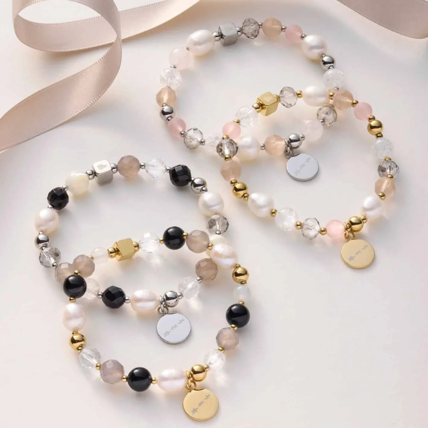 Das Armband HOPE in Goldoptik vereint dezente Farben mit symbolischer Tiefe. Schwarze, rauchgraue und transparente Glasperlen treffen auf opak weiße, oval geschliffene Perlen, die dem Design eine besonders natürliche Ausstrahlung verleihen. Der goldene Anhänger – flach, rund und gravierbar – ist mehr als ein Blickfang: Er bietet Raum für persönliche Botschaften oder Initialen. Dank des elastischen Zugbands lässt sich das Armband ganz einfach über das Handgelenk streifen – perfekt für stilbewusste Frauen, die Schmuck mit Bedeutung lieben.