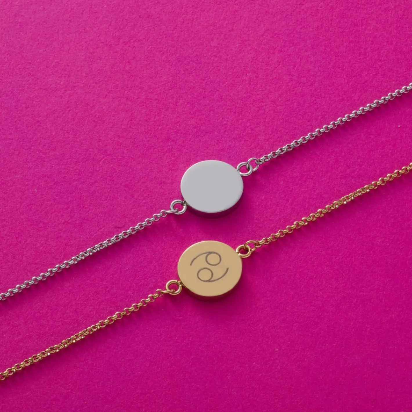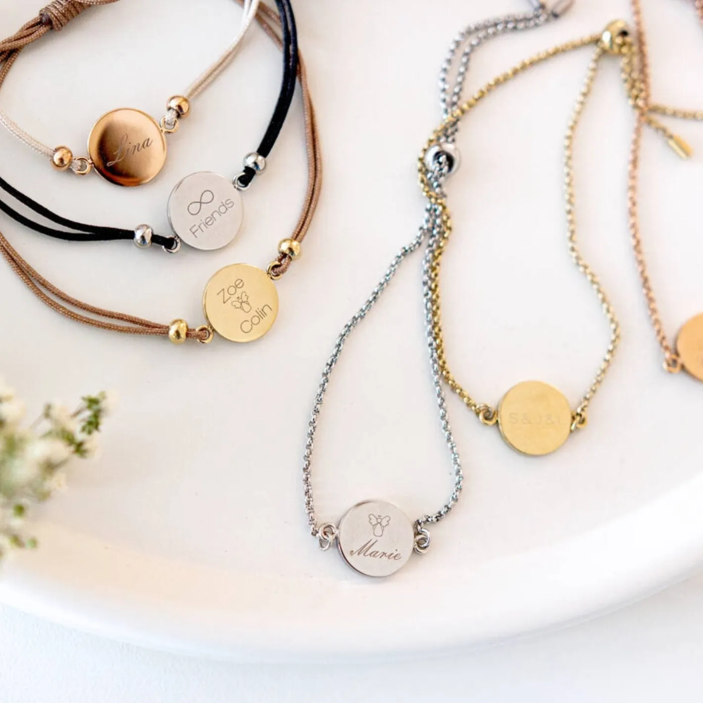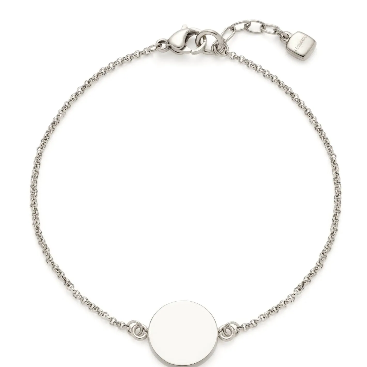 Das feine, silberne Bracelet MARLA beeindruckt mit Schlichtheit und lässt sich perfekt zu anderen Schmuckstücken kombinieren. Das runde Plättchen bietet ausreichend Platz für Ihre individuelle Gravur.