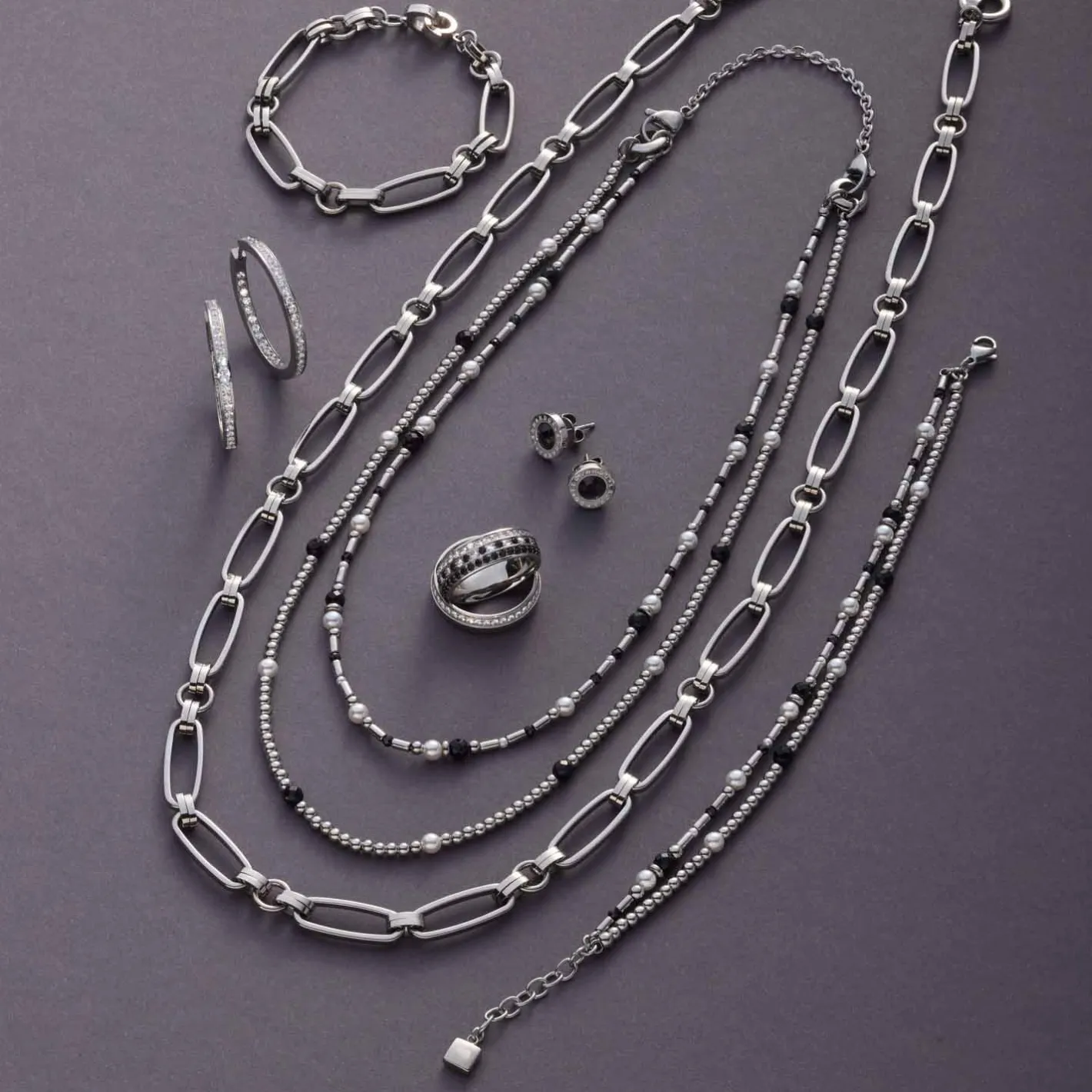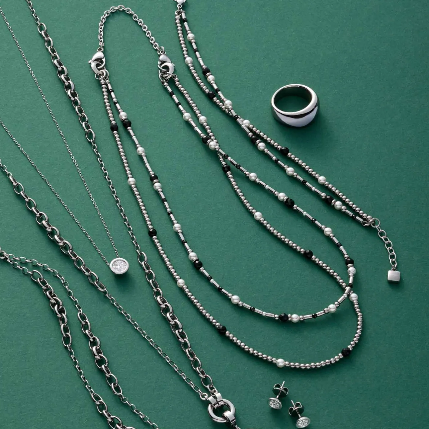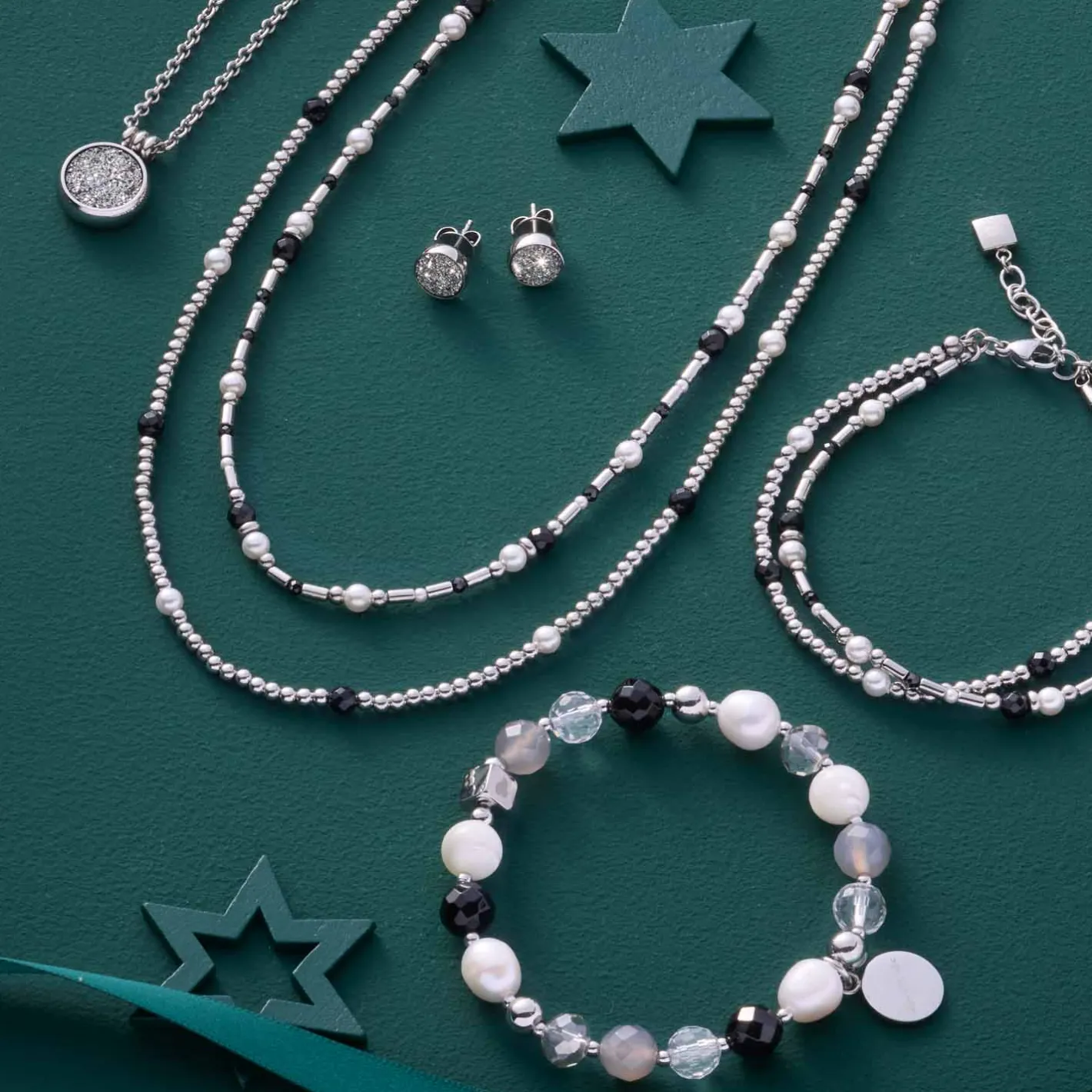 Das Armband SABINE ergänzt die Kette perfekt und bringt den Black & White Trend stilvoll an Dein Handgelenk. Silberfarbene Kugeln und Stäbchen treffen auf schwarze Glasperlen und weiße, natürliche Imitationsperlen. Das doppelreihige Design sorgt für eine moderne Optik, während der Karabinerverschluss mit Verlängerungskette für optimalen Tragekomfort und Anpassung sorgt. Ob solo oder im Set mit der Kette – dieses Armband setzt elegante Akzente.