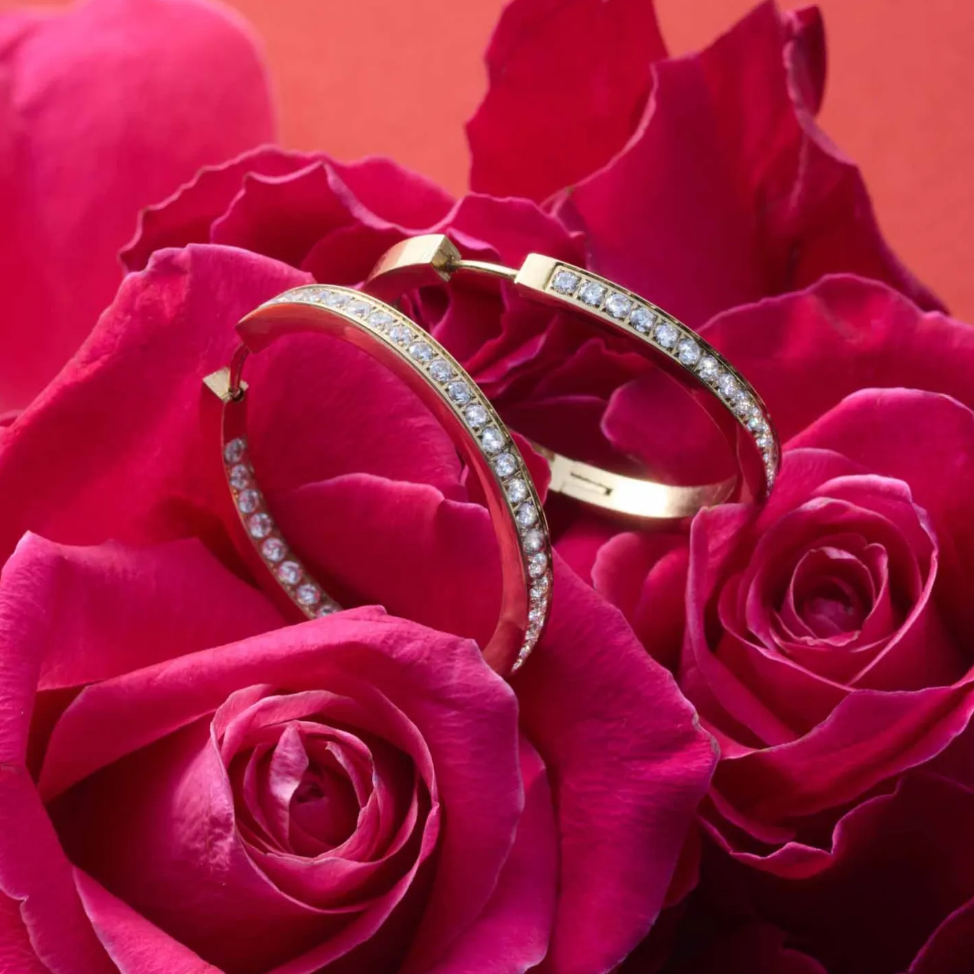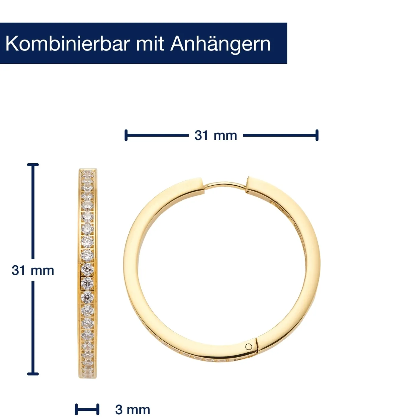 Die vergoldete Creole glänzt mit einem exklusiven Look. Neben der funkelnden Außenseite, ist sie auch innen mit glitzernden Zirkonia Steinen besetzt. Damit versprüht sie eine Extraportion Glamour und Eleganz. Mixe sie mit einer zarten Kette oder lasse sie, am schönsten in Kombination mit geschlossenem Haar, für sich erstrahlen.