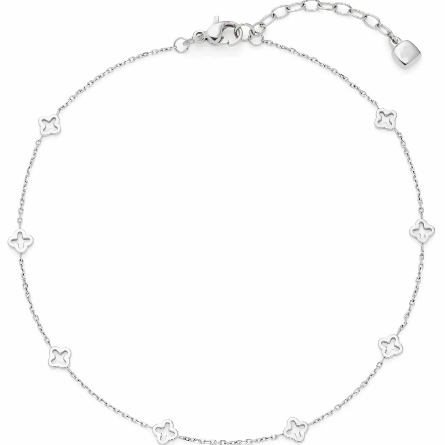 Im Sommer gehören Fußkettchen einfach zum Styling dazu. Dieses Modell passt perfekt zu den anderen Schmuckstücken der Janna-Kollektion. In regelmäßigen Abständen schmücken filigrane, kleine, offene Kleeblatt-Ornamente in grafischer Optik die feine Spiegel-Ankerkette und verleihen ihr eine spielerische Note. Den richtigen Sitz sichern Karabinerverschluss und Verlängerungskette.