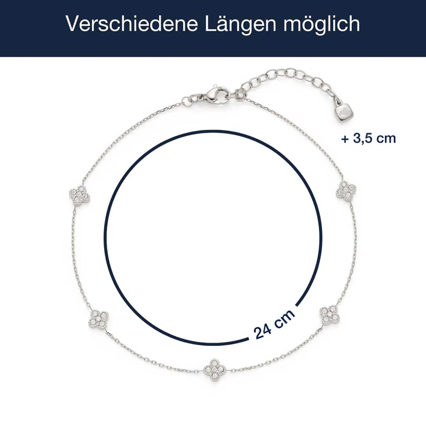 Die Fußkette LISETTE vereint filigranes Design mit elegantem Funkeln und ist das perfekte Accessoire für sommerliche Outfits. Die feine Ankerkette aus poliertem Edelstahl wird durch zarte, blütenförmige Elemente mit funkelnden Zirkonia-Steinen veredelt, die bei jeder Bewegung Lichtreflexe erzeugen. Ihr dezenter Glanz verleiht deinem Look eine feminine Note, ohne aufdringlich zu wirken. Durch den Karabinerverschluss lässt sich die Fußkette leicht anlegen und sitzt angenehm am Fuß. Ob im Alltag, im Urlaub oder zu besonderen Anlässen – die Fußkette LISETTE bringt stilvolle Leichtigkeit und feinen Glanz in deinen Schmucklook.