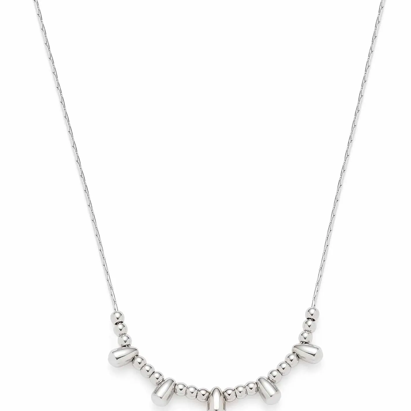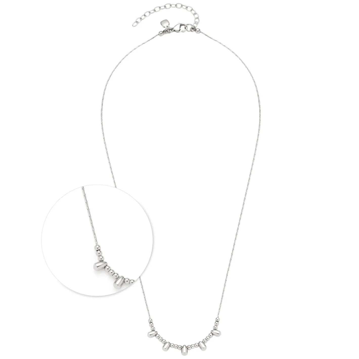 Puristischen Charme versprüht diese kurze Edelstahl-Halskette mit ihrer stilvollen Komposition aus einer sehr feinen Venezianer-Inka-Kette und einem kompakten Einsatz aus winzig kleinen Edelstahl-Perlen und Edelstahl-Tropfen. Über Karabinerverschluss und Verlängerungskettchen lässt sich das zarte Collier in seiner Länge variieren. Der polierte Edelstahl verleiht dem Schmuckstück eine kühle Ausstrahlung.