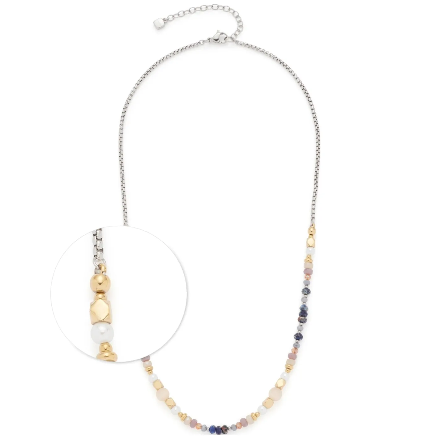 Harmonische Farbkomposition, zeitloses Design und edle Materialien: Diese Kette verschönert einfach jeden Look. Die kurze Kette zeigt sich mit verschiedenen Perlen in Blau, Beige, Creme und Weiß. Im Kontrast dazu hat die Venizianerkette ein Mittelstück aus gereihten Halbedelsteinperlen (Sodalith), Perlmutt- und Glasperlen. Abgerundet wird der stilvolle Mix mit weißen Imitationsperlen und goldenen, facettierten Würfelchen. Eine dezente Optik, die gerade deshalb so besonders wirkt und schön zu allen Cashmere-Looks passt. Der Karabinerverschluss und die Verlängerungskette sind zudem ein praktisches Detail.