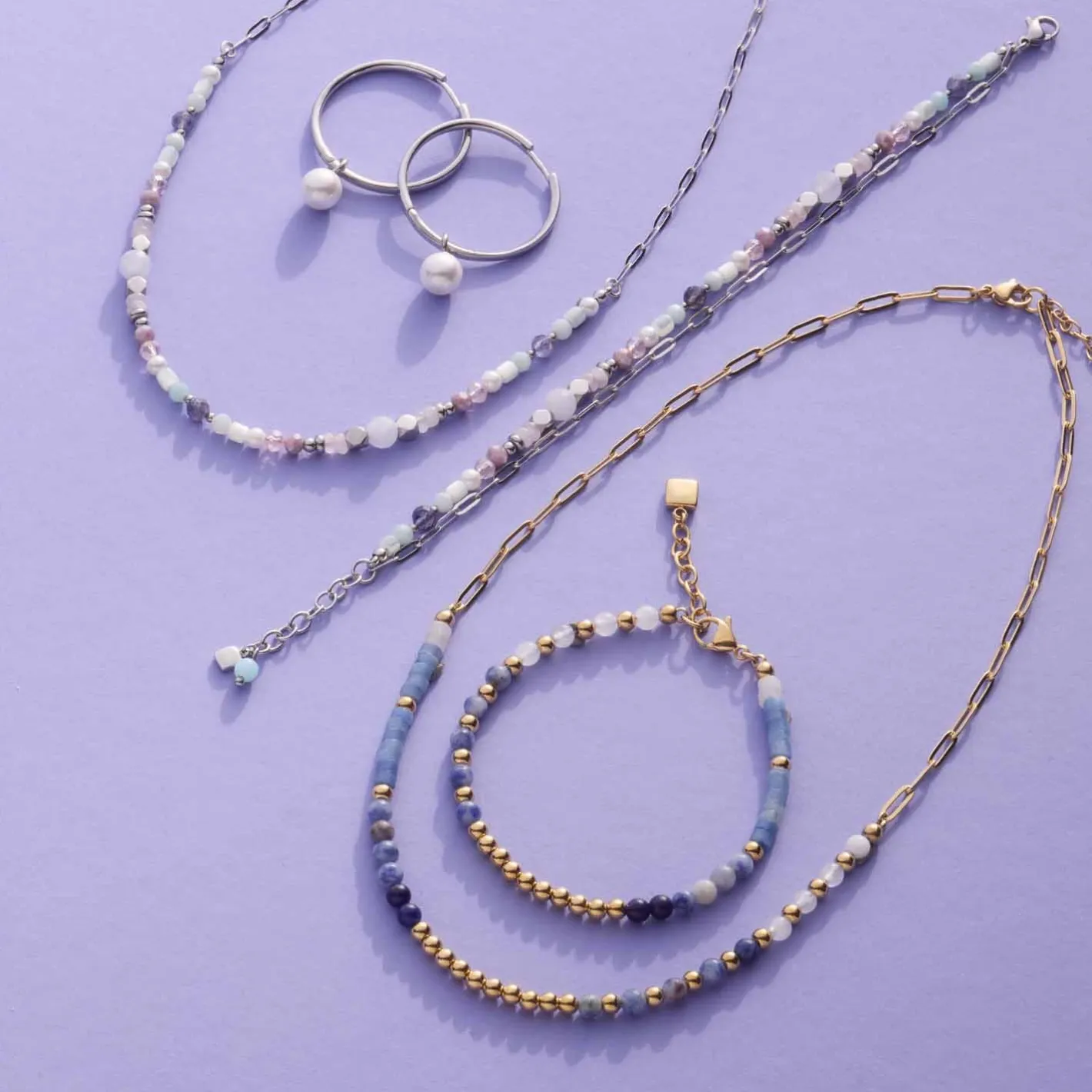 Voller Harmonie präsentiert sich diese vergoldete Halskette. Das Zusammenspiel unterschiedlicher Steine in Walzen- und Kugelform macht sie zum eleganten Hingucker. Die zarten Natursteine zeigen sich in einem sanften Verlauf von weiß zu blau. In der Kombination mit poliertem Gold erhält die Kette einen modernen Kontrast, der mit der Paperclip-Kette schön unterstrichen wird. Diese Kette schafft eine perfekte Balance zwischen Statement-Piece und purer Eleganz – ein neuer Everyday-Favorite für dich.