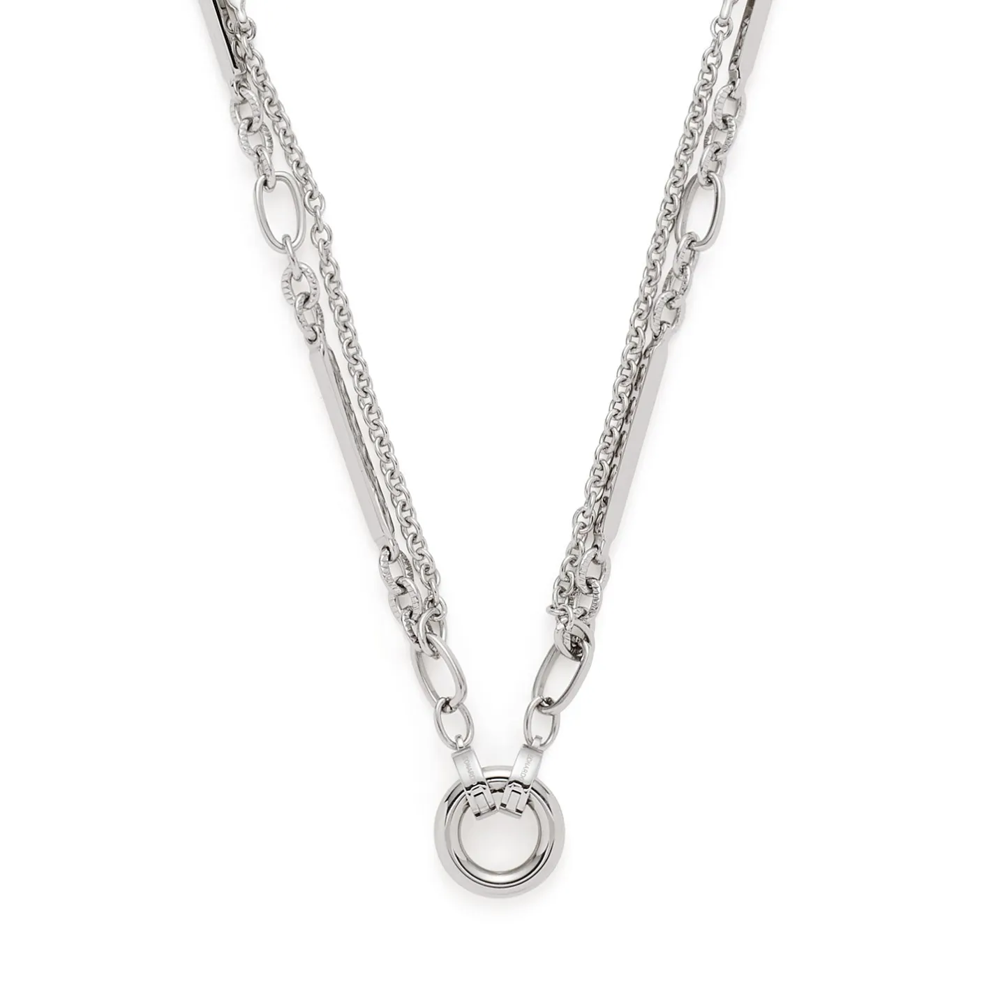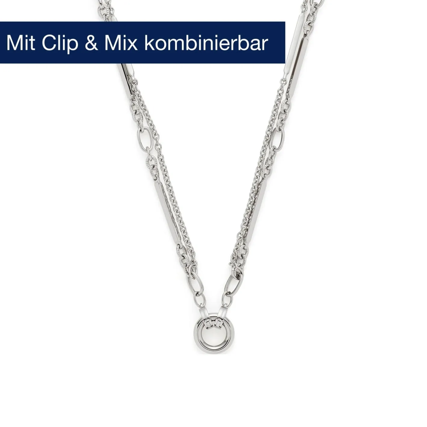 Verleihe deinen Looks ein modernes Finish mit dieser kontrastreichen Kette. Sie besteht aus zwei unterschiedlichen Ketten, die zu einer zusammengeführt werden. Bei der einen treffen streichholzlange, eckige Stäbchen auf eine Reihe von Kettengliedern unterschiedlicher Größe und Struktur. Als Gegenpart zeigt sich eine Ankerkette im schlichten Design. Das Schmuckstück kannst du wunderbar mit einem großen, dekorativen Clip-Anhänger aus der Leonardo-Kollektion vorne schließen.