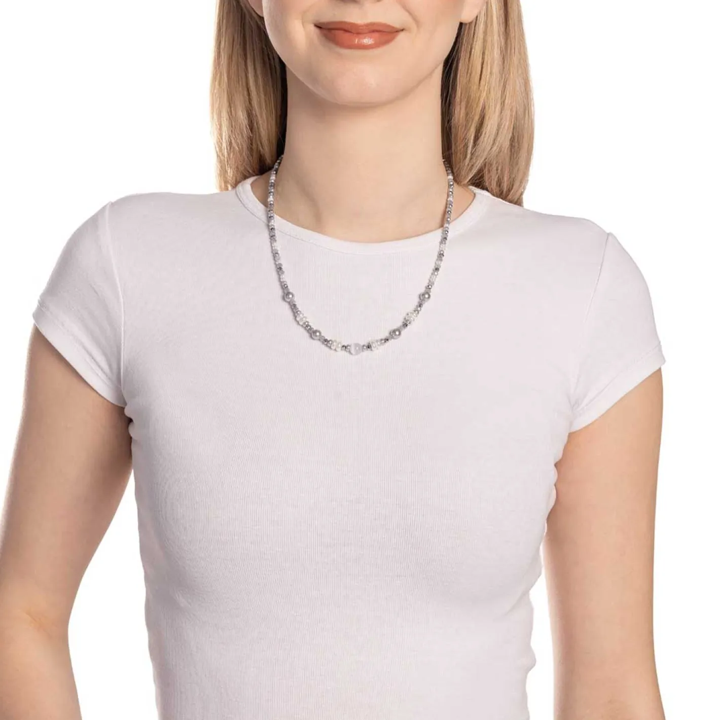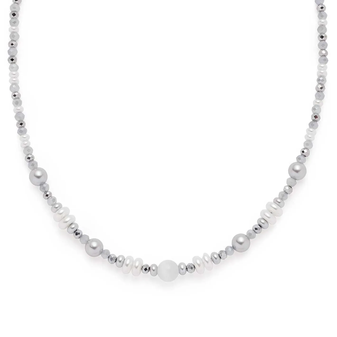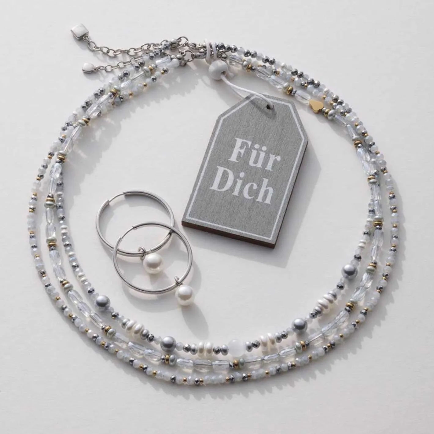 Die Kette KLARA von JEWELS BY LEONARDO ist ein eleganter Begleiter für alle, die zarte Farben und moderne Eleganz lieben. In einer harmonischen Mischung aus Weiß, Grau und sanftem Blau vereint sie glänzende Metallakzente mit schimmernden Perlen und Hämatit-Elementen. Die mittig platzierte, größere Perle bildet den strahlenden Mittelpunkt, von dem aus sich die Kette sanft nach hinten verjüngt. Ihr Farbspiel in der Trendnuance „Blue Aura“ verleiht ihr eine kühle, sommerliche Leichtigkeit, die perfekt zu modernen Metallic-Looks passt. Durch den Karabinerverschluss mit Verlängerungskette lässt sich die Länge individuell anpassen – ideal für verschiedene Ausschnittformen. Ob zu schlichten Outfits oder eleganten Styles: KLARA bringt dezente Eleganz und frische Akzente in dein Schmuckstyling. Besonders schön wirkt sie in Kombination mit passenden Armbändern oder Ohrringen von JEWELS BY LEONARDO.