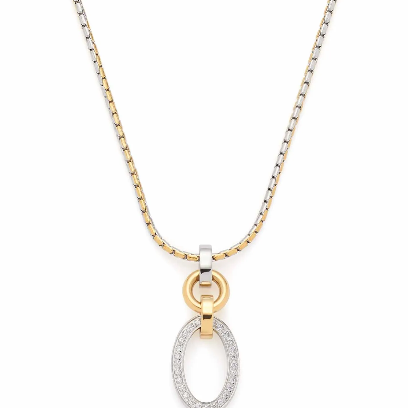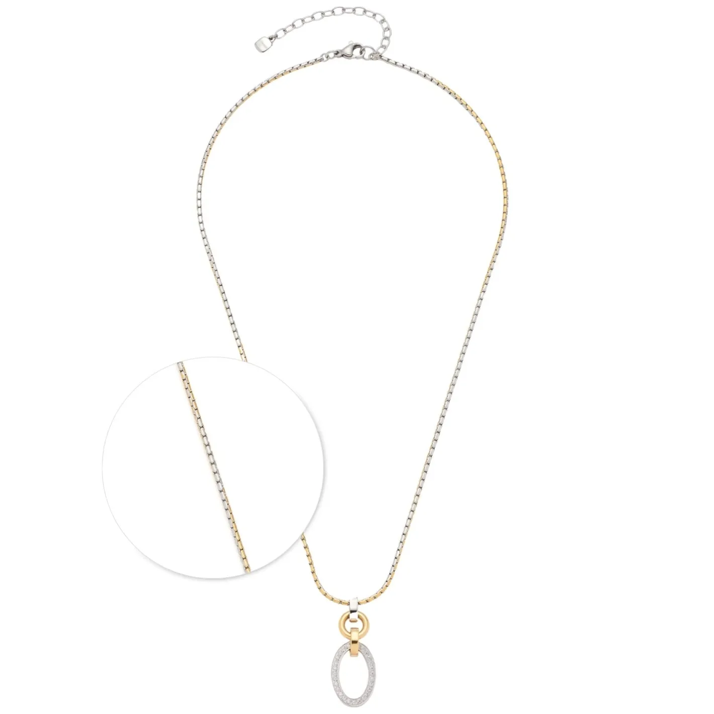 Die Halskette setzt auf den aktuellen Trend massiv gearbeiteter Kettenglieder. Die Kette ist zweifarbig gestaltet V eine Hälfte in glänzendem Edelstahl und die andere Hälfte mit goldener Ionenplattierung. Durch Bewegung und das Rollen der Kette am Hals entsteht ihr schöner Bicolor-Effekt. Verschieden große Kettenglied-Elemente ergeben in ihrer Zusammensetzung den Anhänger dieser Kette. Das große, ovale Schlusselement ist mit klaren, facettierten und gefassten Zirkonia-Steinchen besetzt und setzt das Dekolleté stilsicher in Szene.