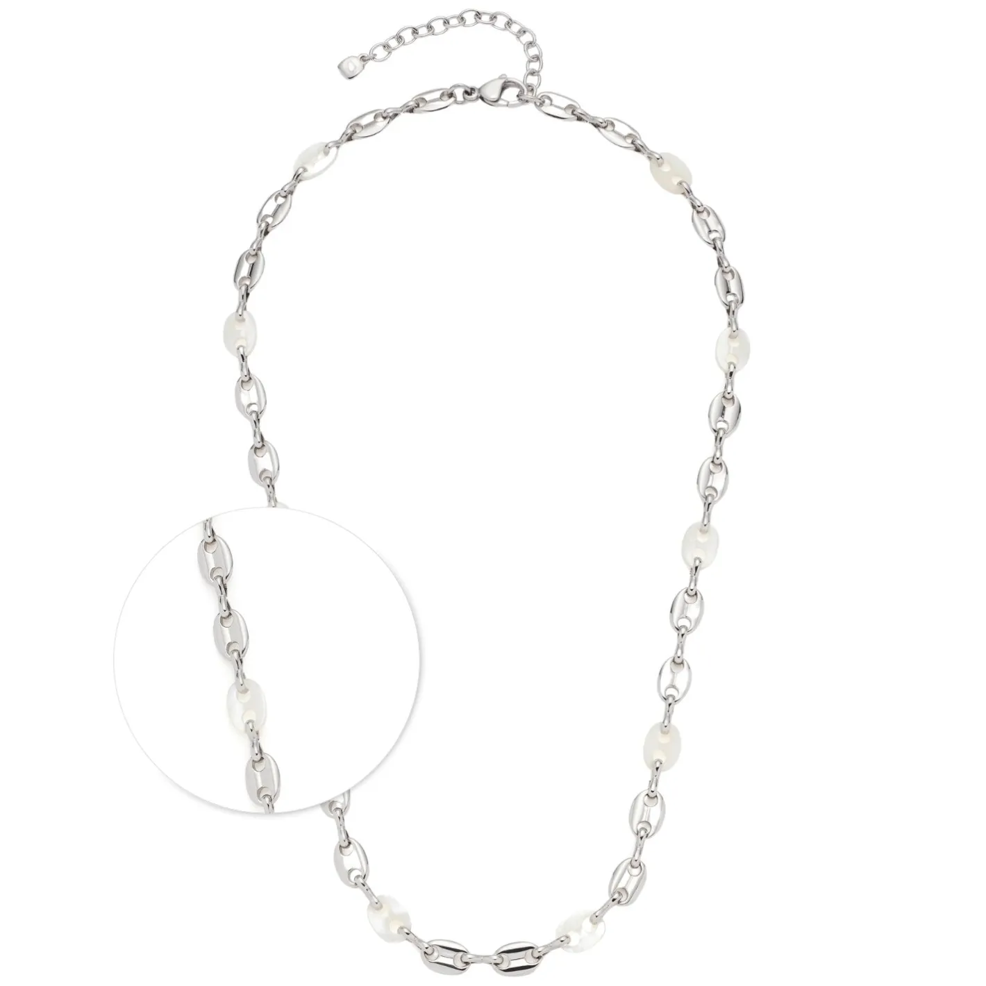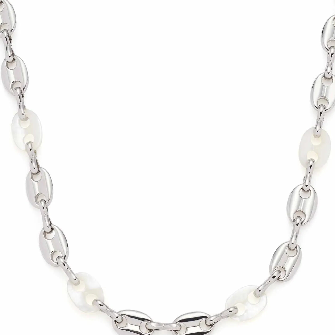 Weich gerundete, ovale Schiffsanker-Kettenglieder sind bei dieser Halskette direkt miteinander verbunden und wechseln sich mit handgearbeiteten Perlmuttgliedern ab. Das kurze Collier spielt mit dem Kontrast aus dem kühl-glänzenden Edelstahl und zart schimmerndem Perlmutt. So ergibt sich ein wunderschönes, anschmiegsames Schmuckstück, das sowohl im sportiven Alltag als auch im eleganten Abendlook überzeugt.